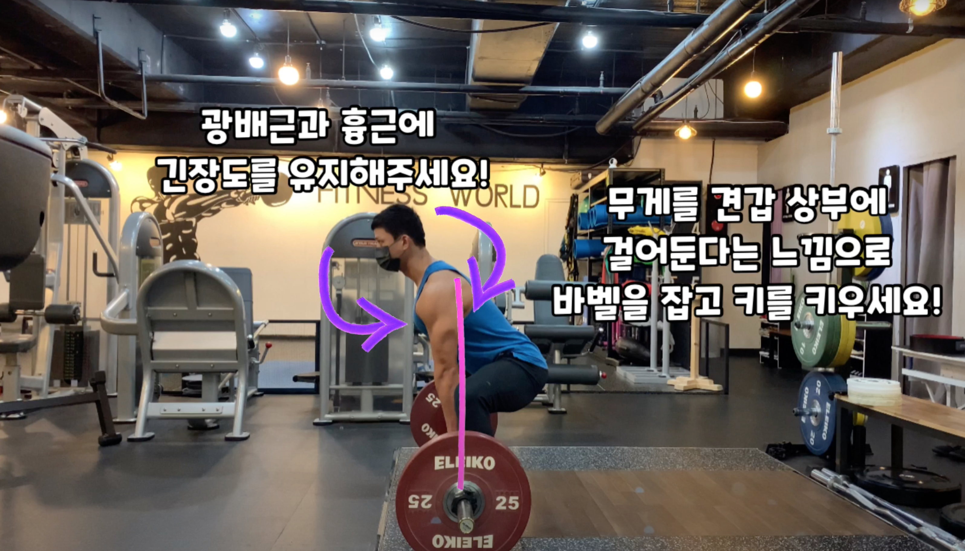 하강 2 = 광배근과 흉근에 긴장도를 유지하고 컨벤 데드와 다르게 상체를 숙이는 느낌이 아니라 아래로 천천히 앉는다는 느낌으로 바벨을 잡습니다.