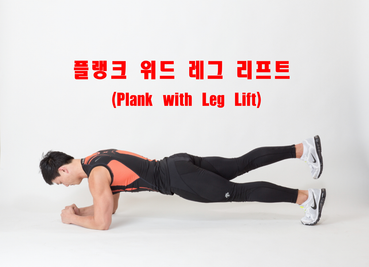 1. 플랭크 포지션에서 복부와 둔근, 대퇴부에 힘을 줘 자세를 유지하고 왼쪽 다리를 천천히 든다.