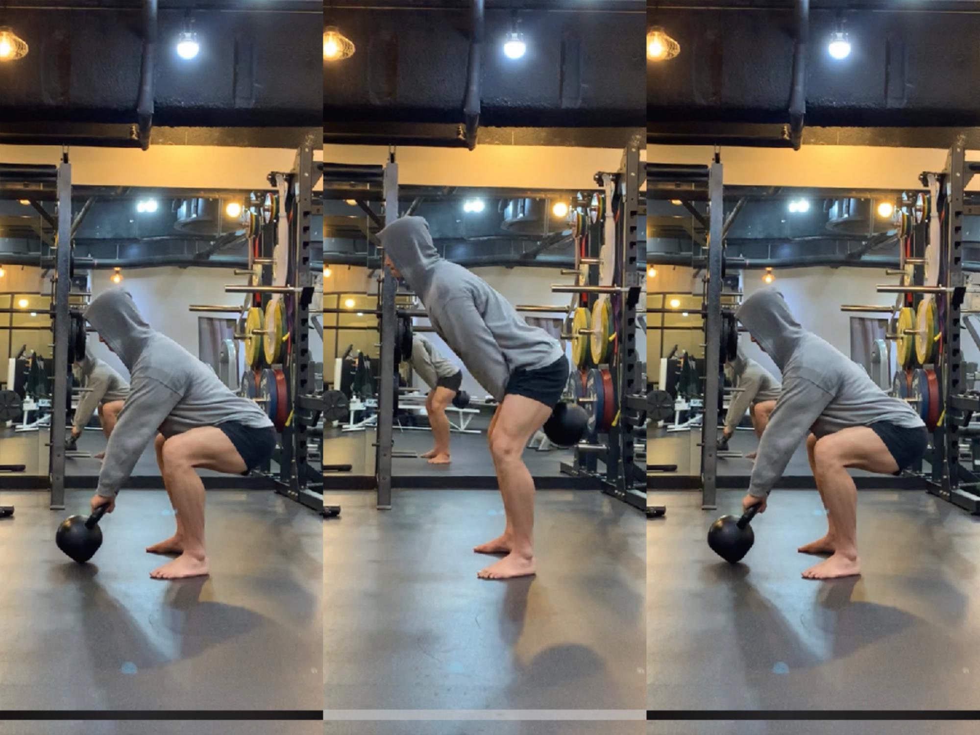 2. 지면에 있는 케틀벨을 잡고 엉덩이까지 케틀벨을 가져와 몸을 폭발적으로 폄과 동시에 케틀벨을 가슴 앞까지 들어 올린다.