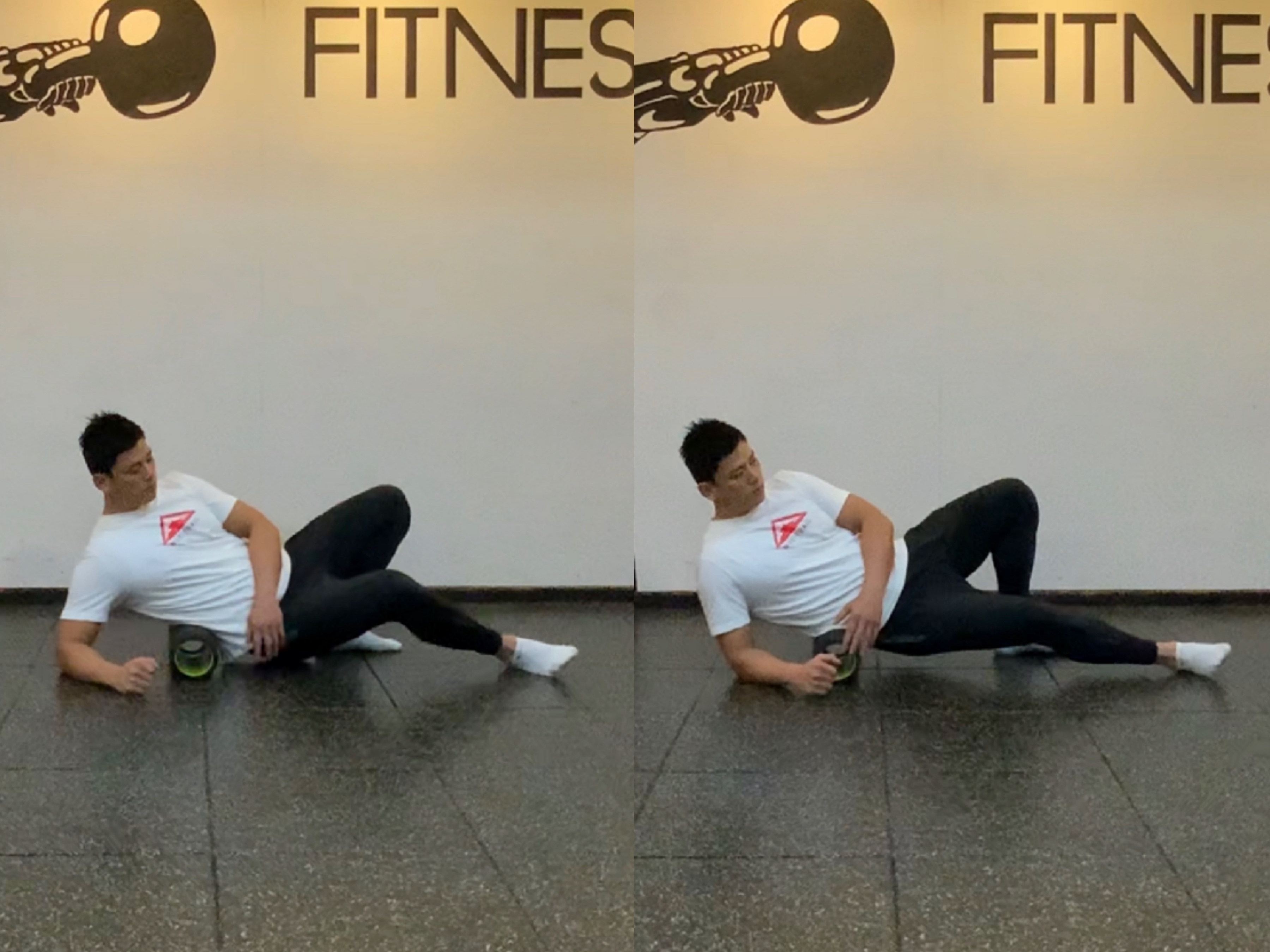 3. 몸을 측면으로 기울여 폼롤러를 광배근쪽에 위치합니다.