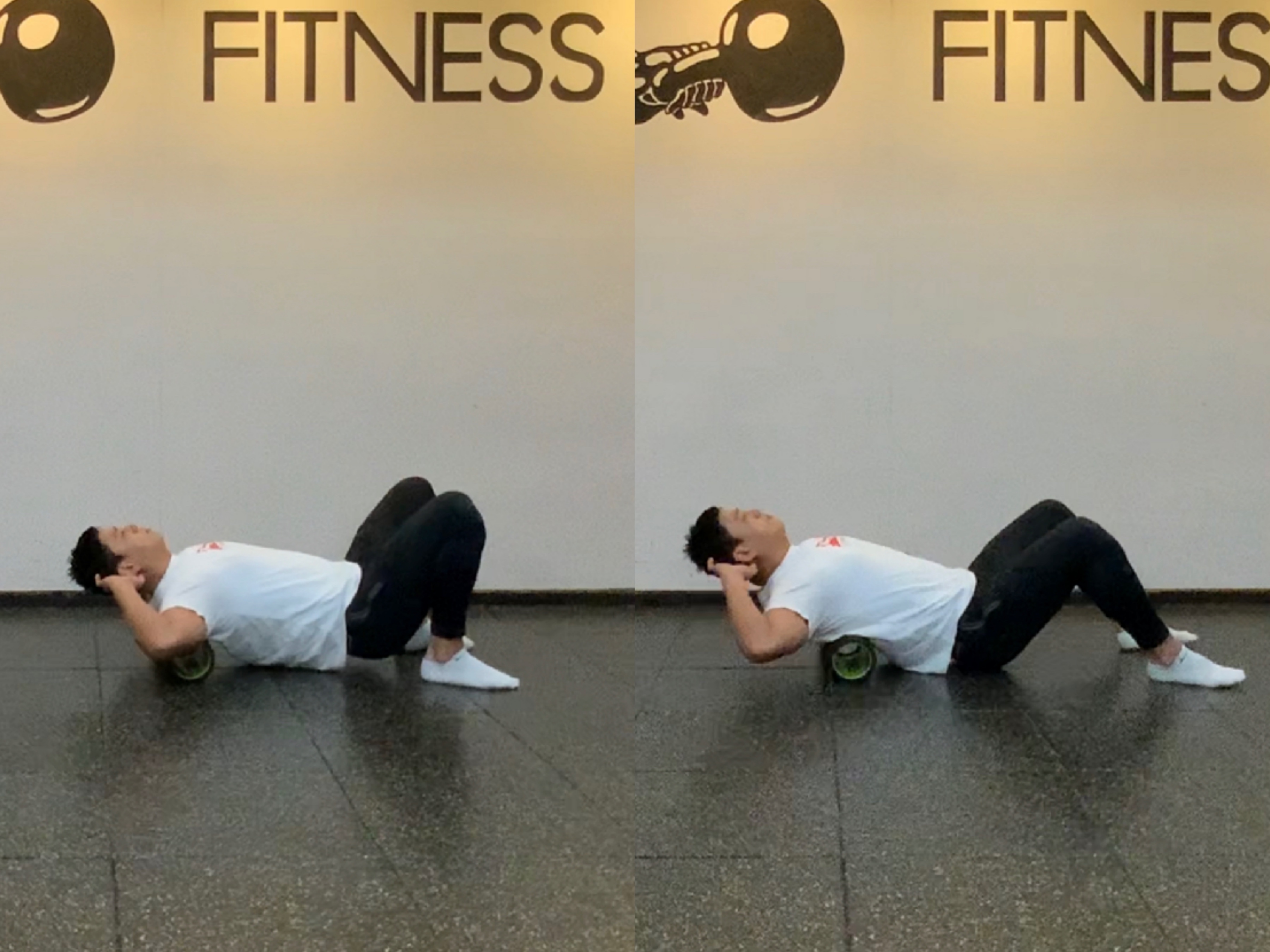 1. 폼롤러를 상부 등에 위치하고 양손은 머리 뒤에 두고 하늘을 봅니다.