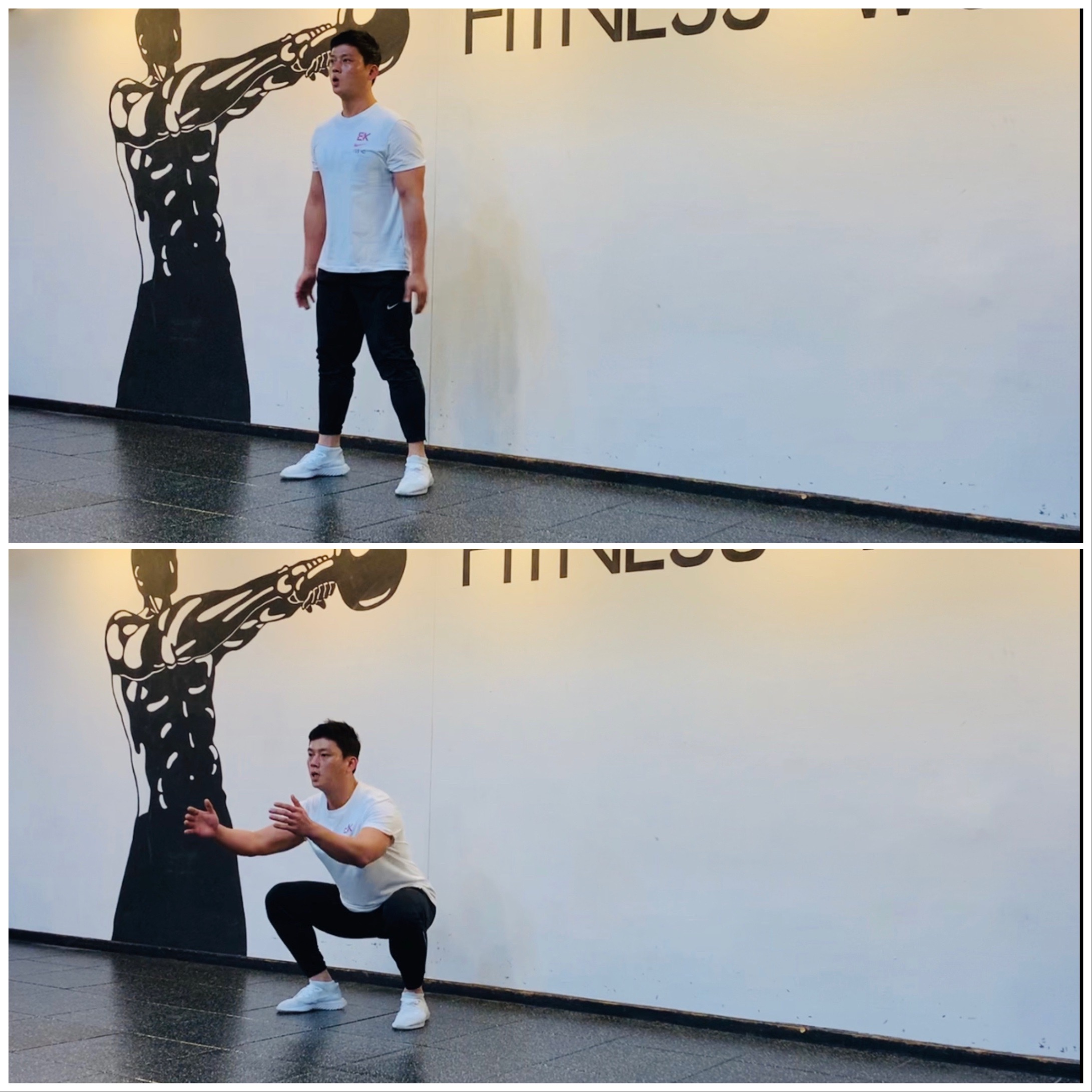 3. 엉덩이가 무릎보다 낮은 위치에 왔을 때 호흡을 내쉬며 시작 자세로 돌아와 동작을 반복한다.