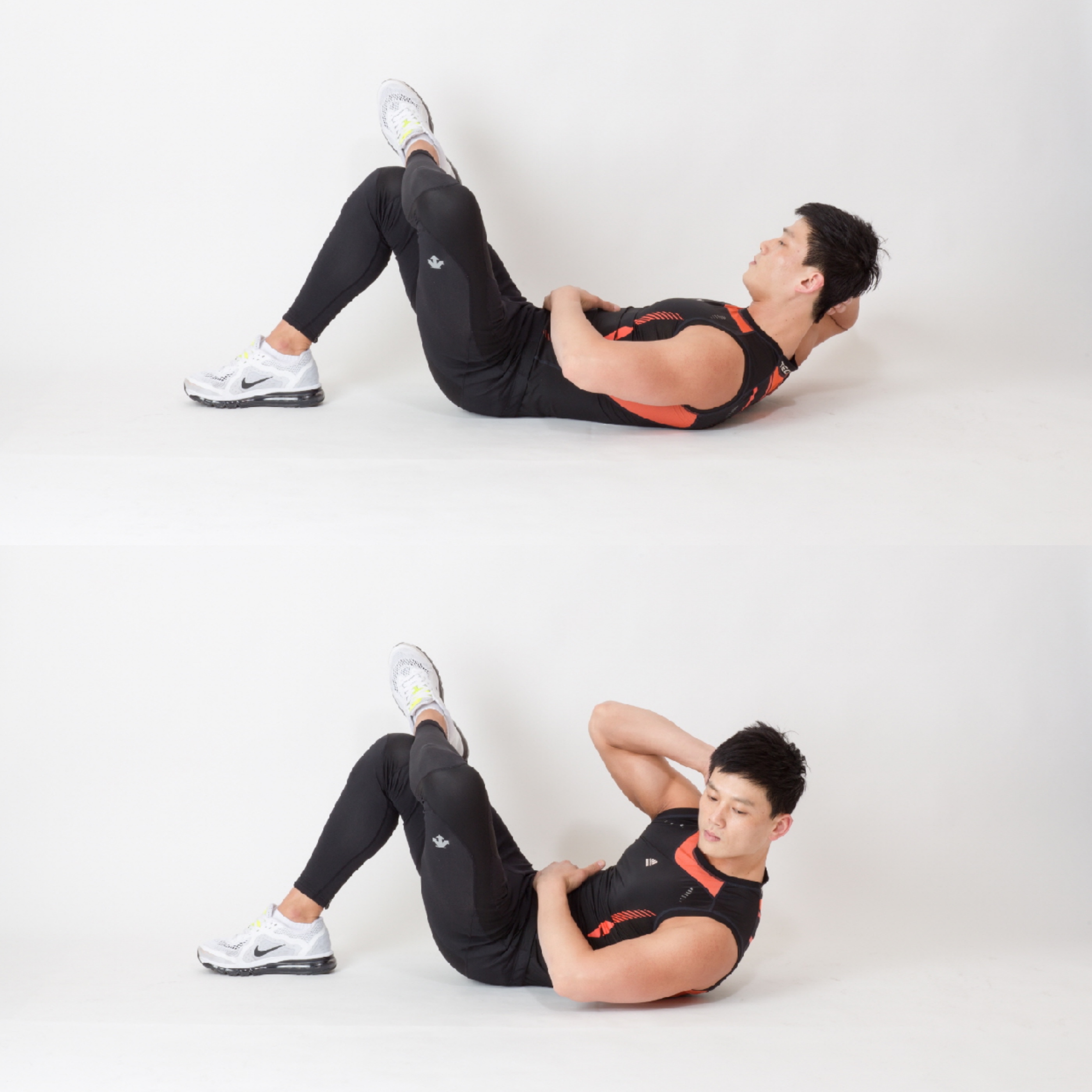 2. 양다리는 90도 굽혀 다리와 몸이 직각이 되게 들고 나서 오른쪽 다리를 45도 정면으로 편다. 이때 몸은 왼쪽으로 비틀면서 오른쪽 어깨를 들고 왼쪽 무릎을 몸 쪽으로 당긴다.