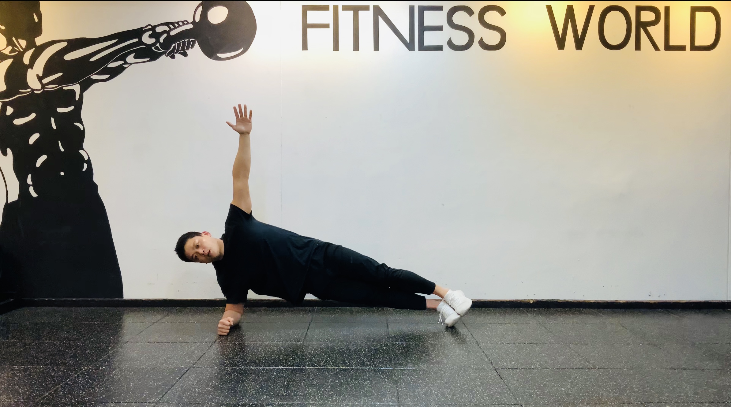 2. 몸통에 힘을 줘 골반을 들어 몸통과 다리가 일직선이 되게 하고 왼쪽 손끝은 하늘을 향한다.