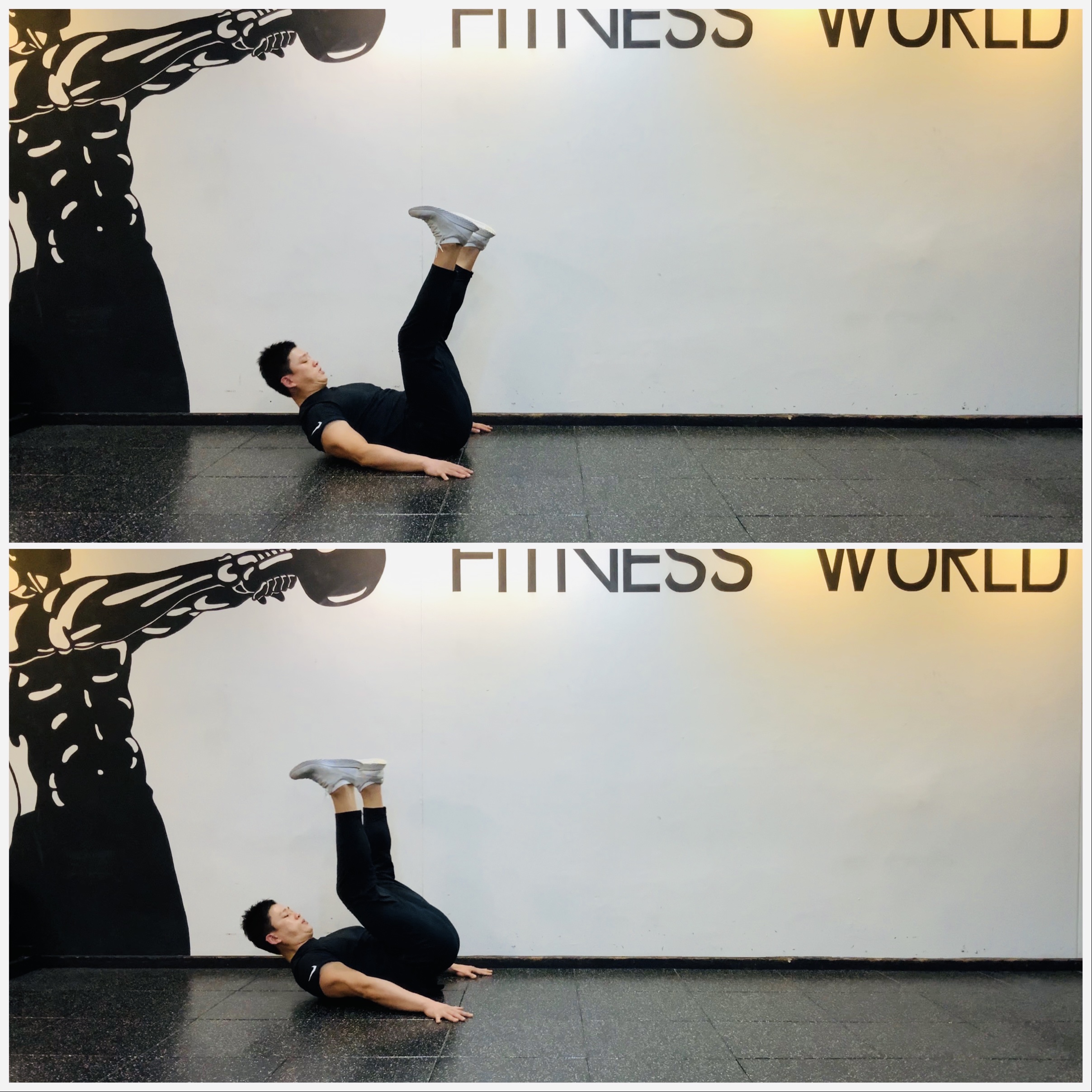 1. 지면에 누워 양손은 엉덩이 옆에 위치하고 무릎은 가볍게 굽혀 대퇴부와 몸통이 90도가 되도록 든다.