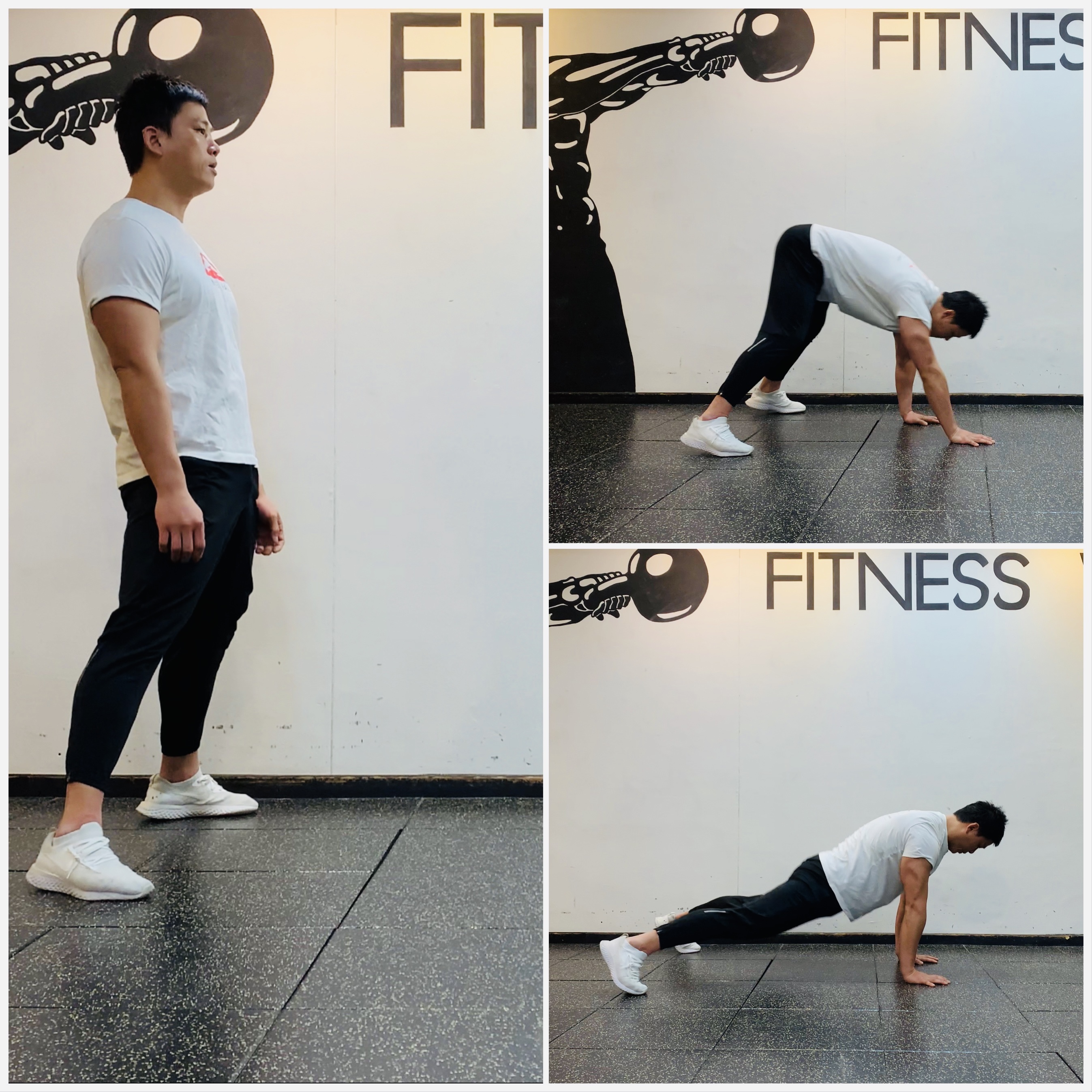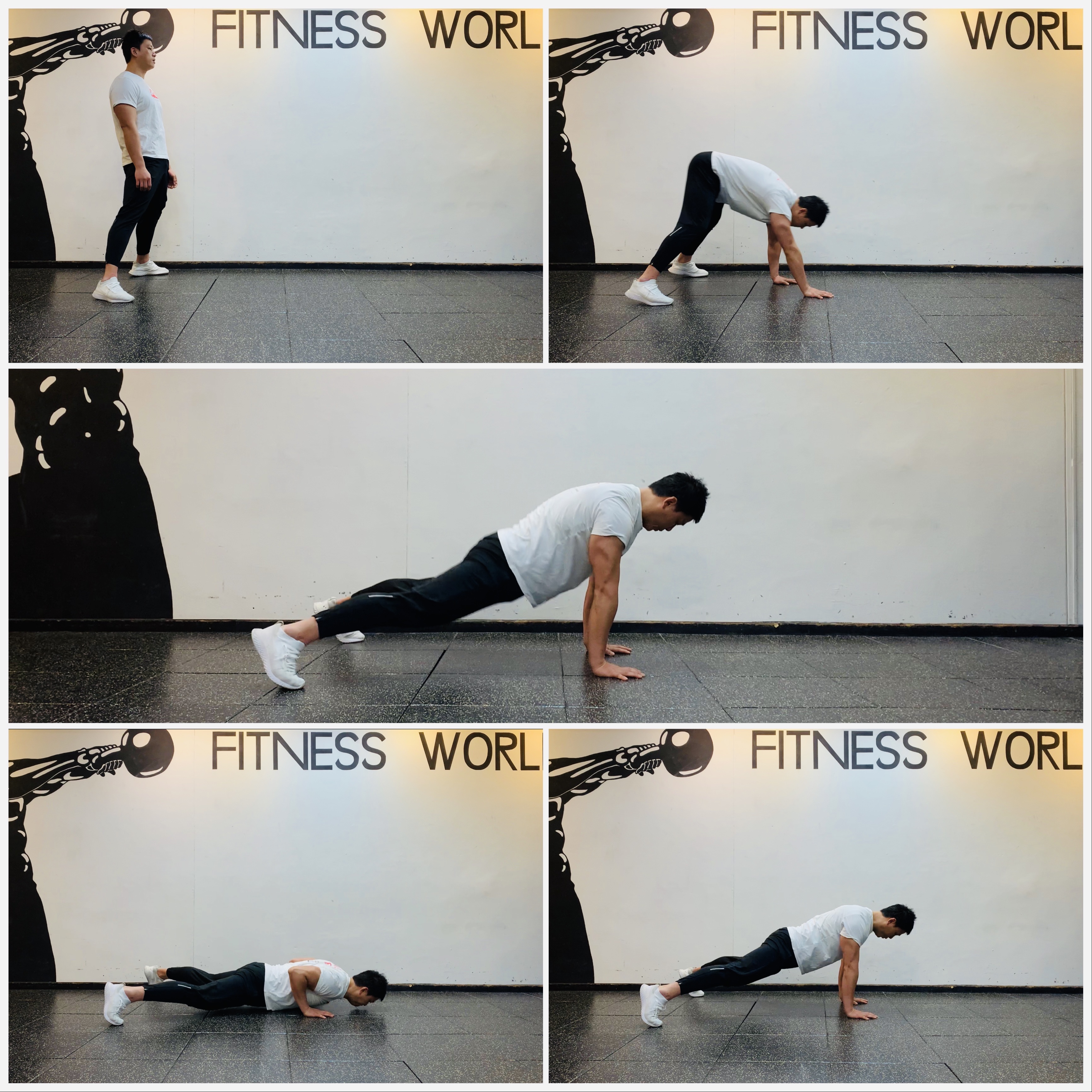 2. 양손이 어깨 아래 위치하고 몸이 일직선이 된 후 몸통에 힘을 주고 팔 굽혀 펴기를 1회 한다.