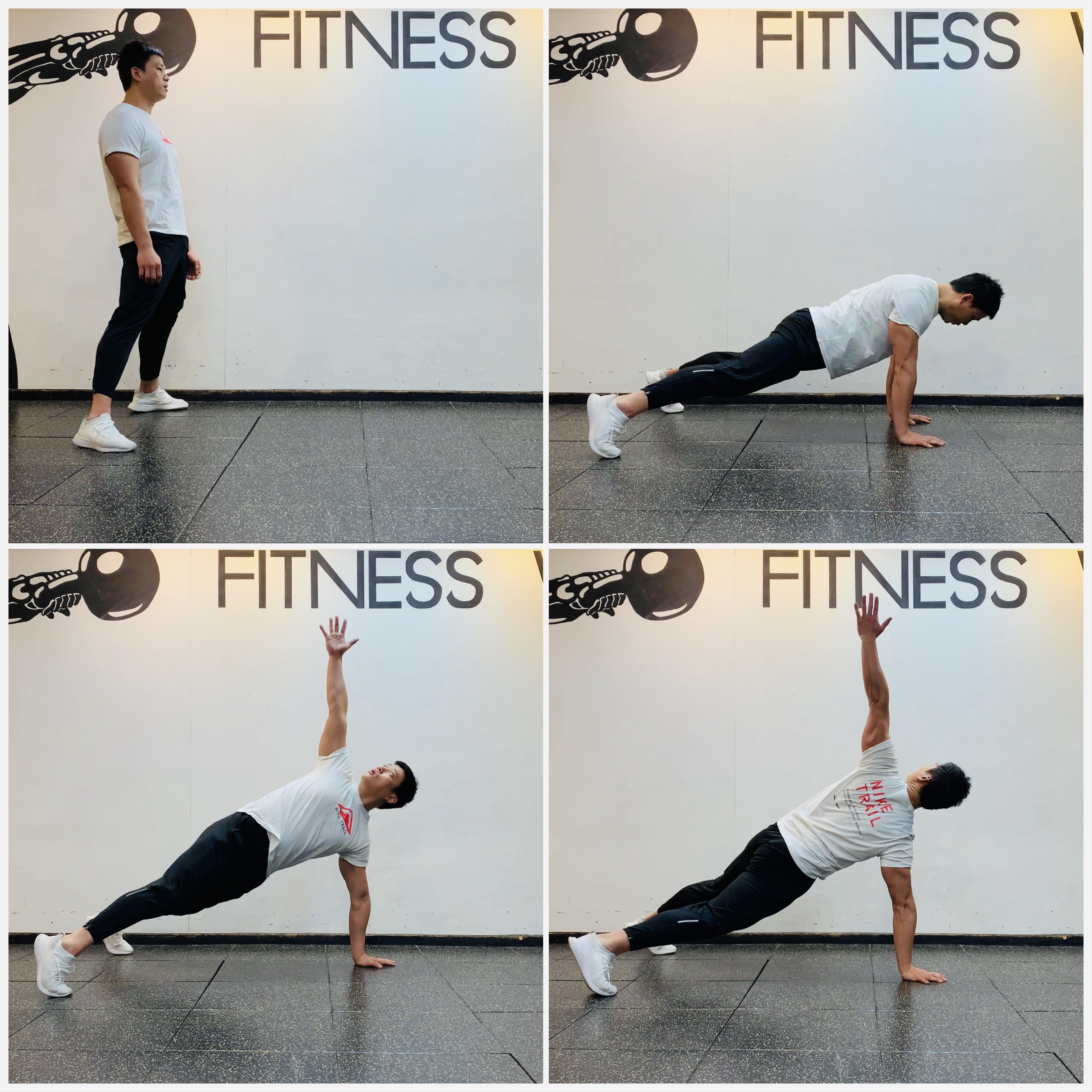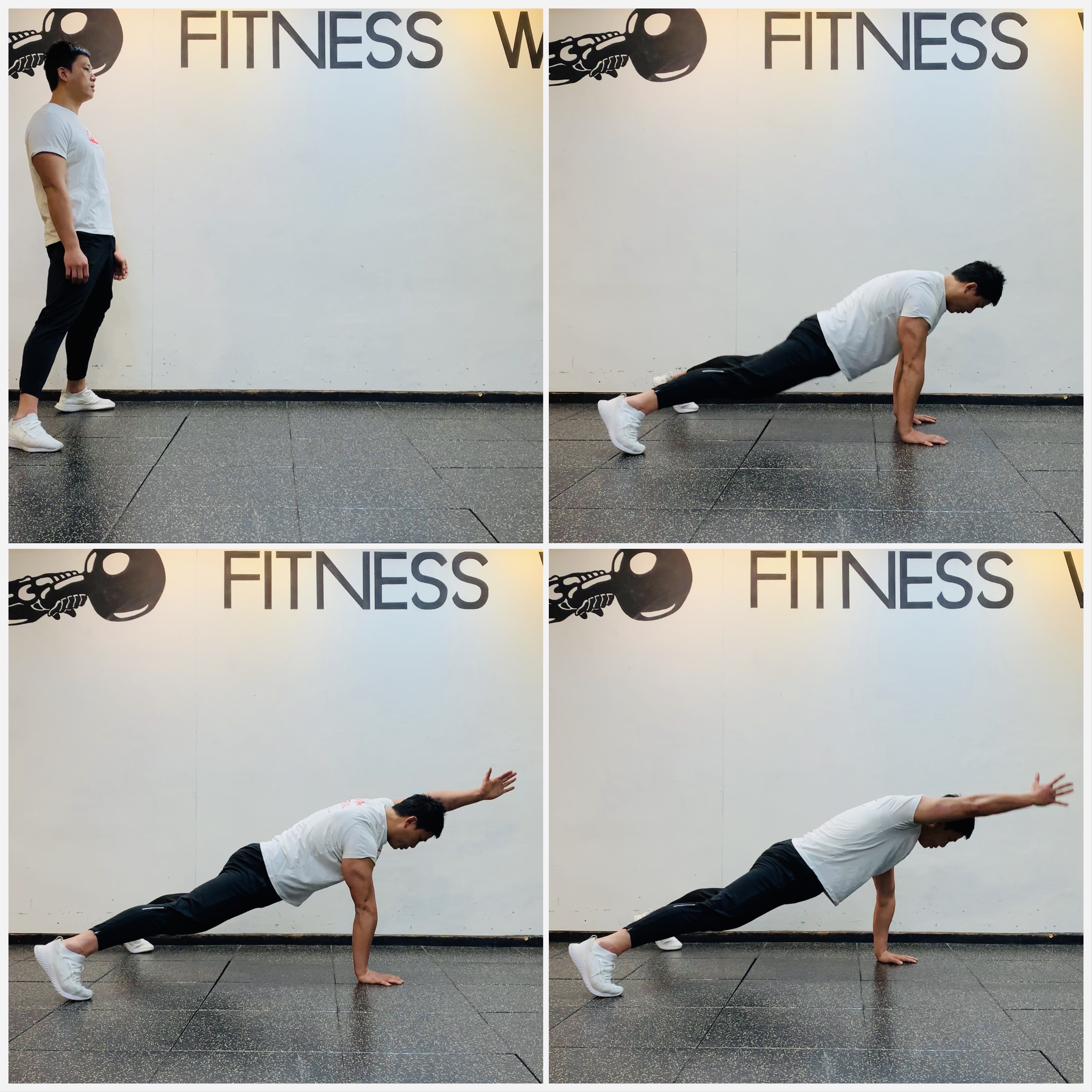 2. 양손이 어깨 아래 위치하고 몸이 일직선이 된 후 몸통에 힘을 줘 자세를 유지하고 몸통을 비틀어 오른쪽 손끝이 하늘을 향하게 한다.