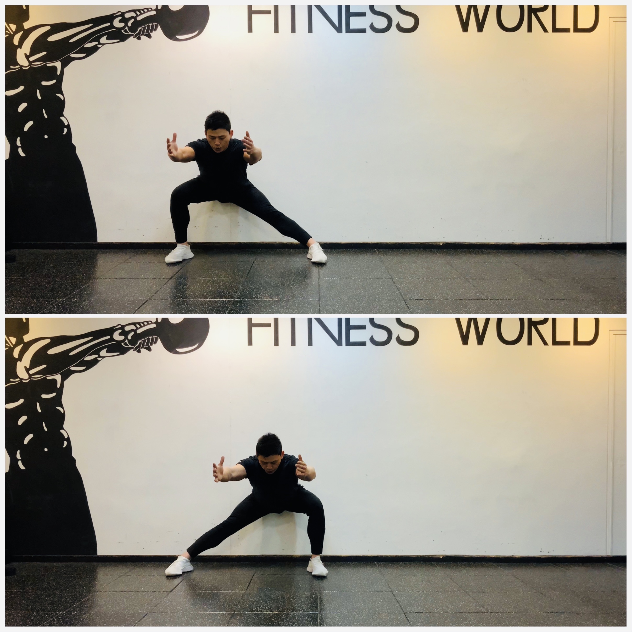 1. 다리는 어깨 너비 두배로 벌리고 양 발끝은 45도 바깥을 향하고 선다.