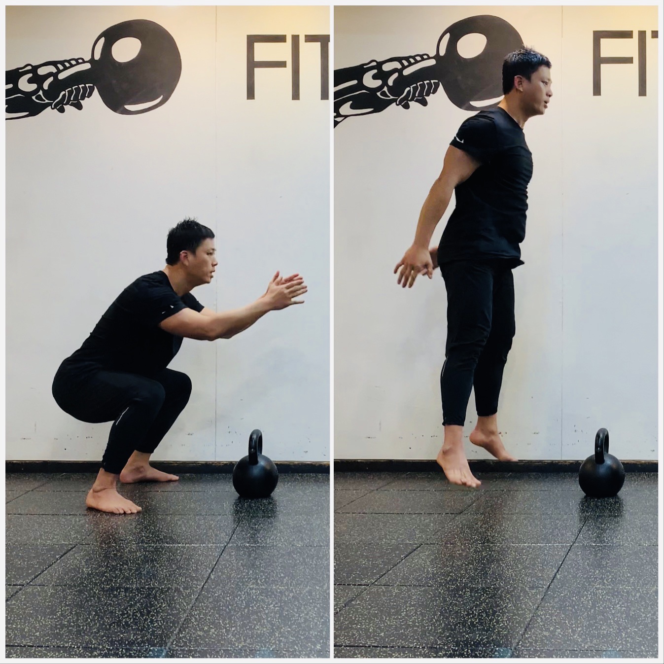 3. 척추의 정렬은 항상 유지하고 엉덩이가 무릎보다 낮은 곳에 왔을 때 호흡을 내쉬며 일어나 점프한 후 동작을 반복한다.