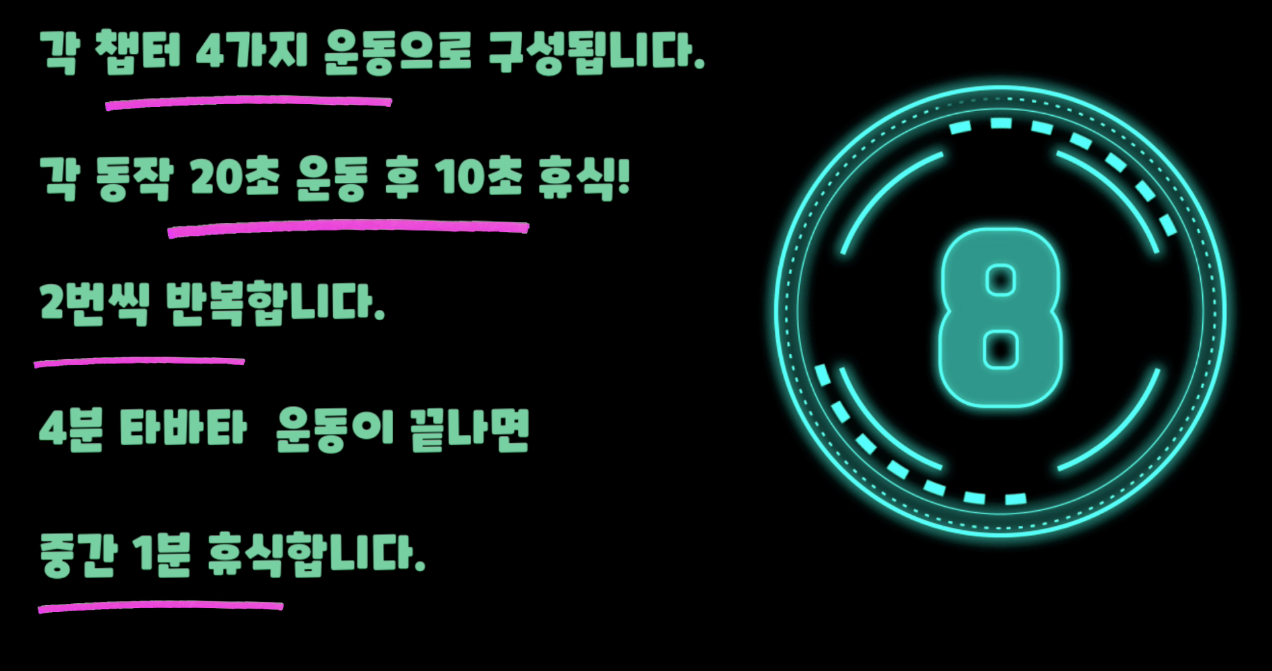 4가지 동작을 20초 운동 10초 휴식 후 2번씩 반복합니다.