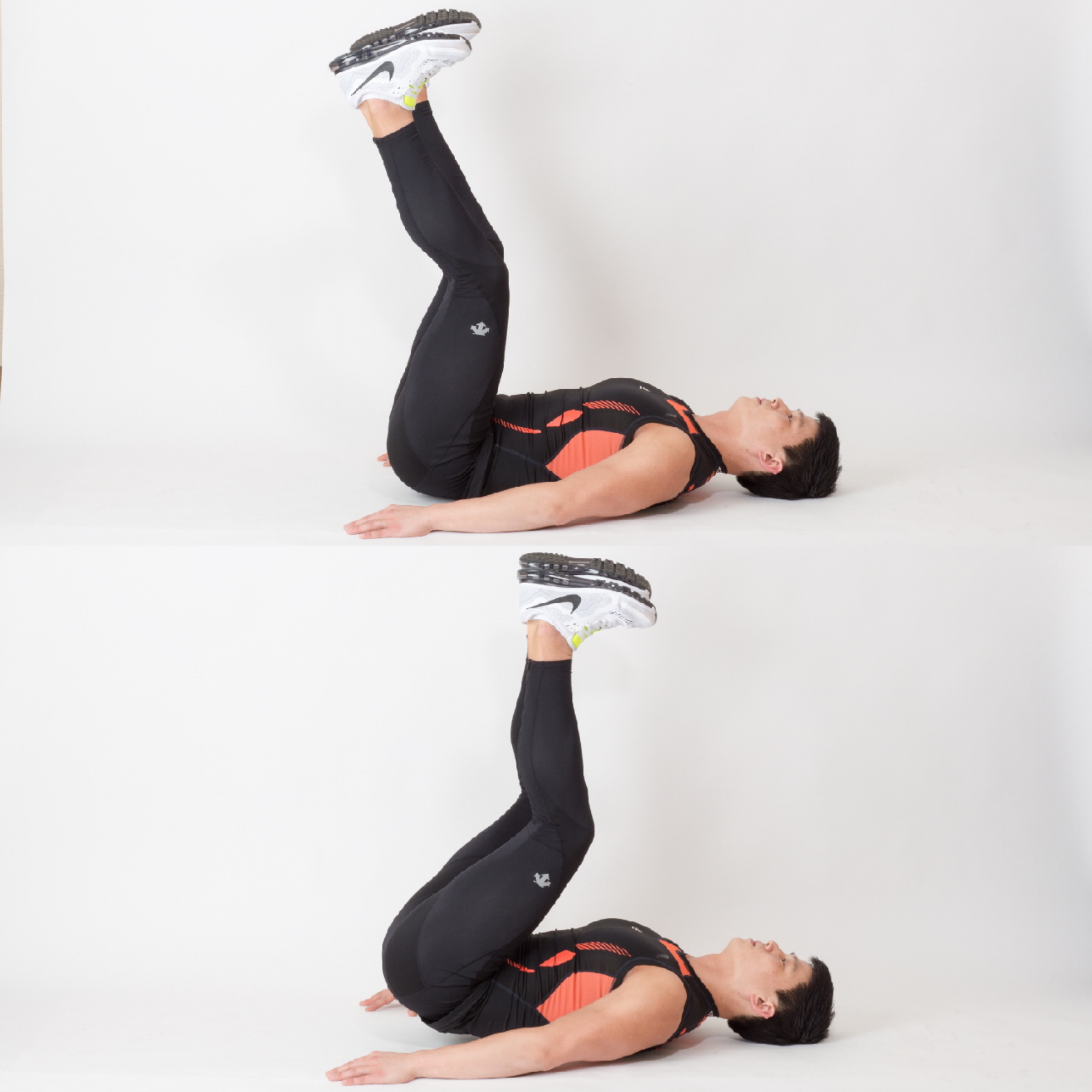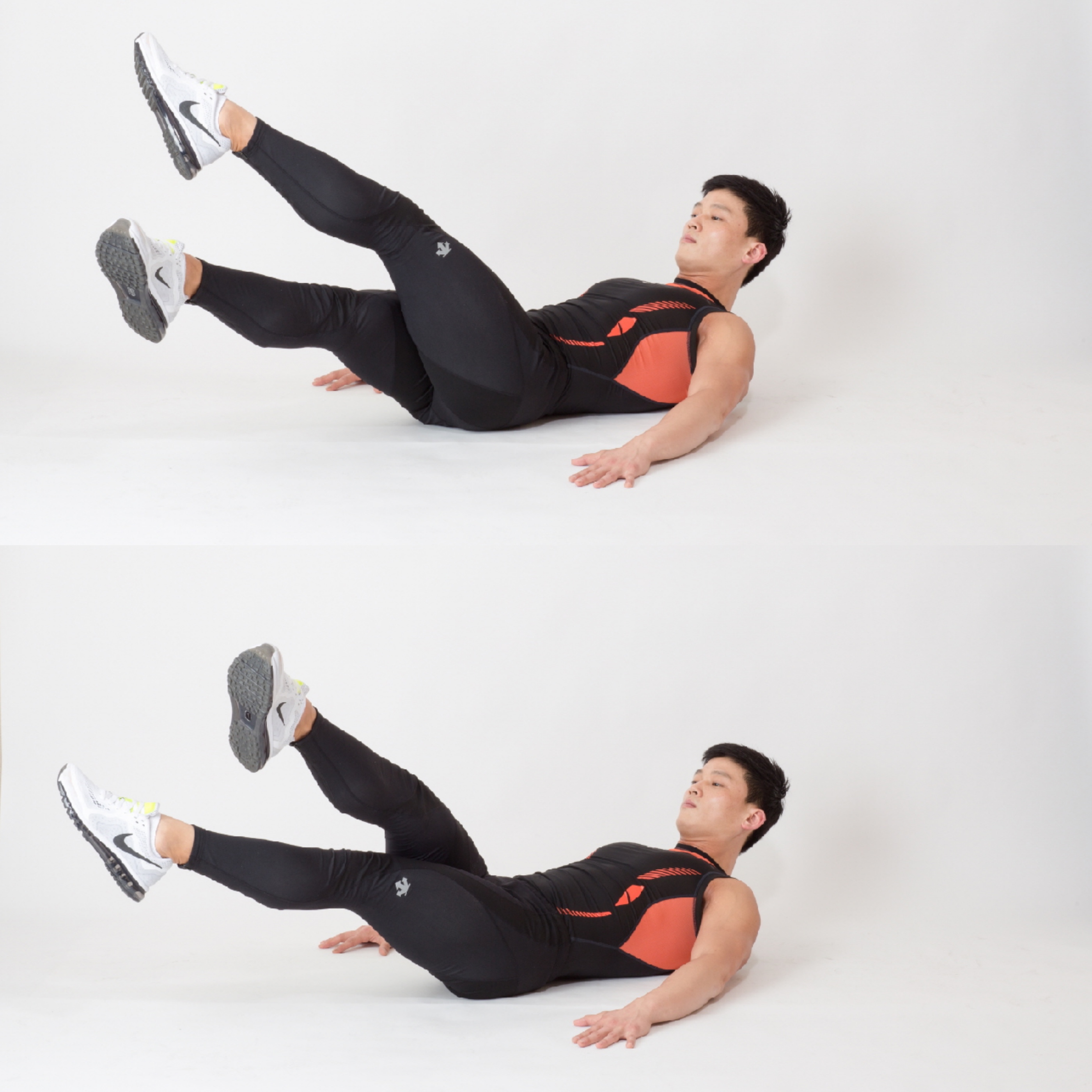 1. 지면에 누워 양손은 엉덩이 옆에 위치하고 양발을 들어 올린다.