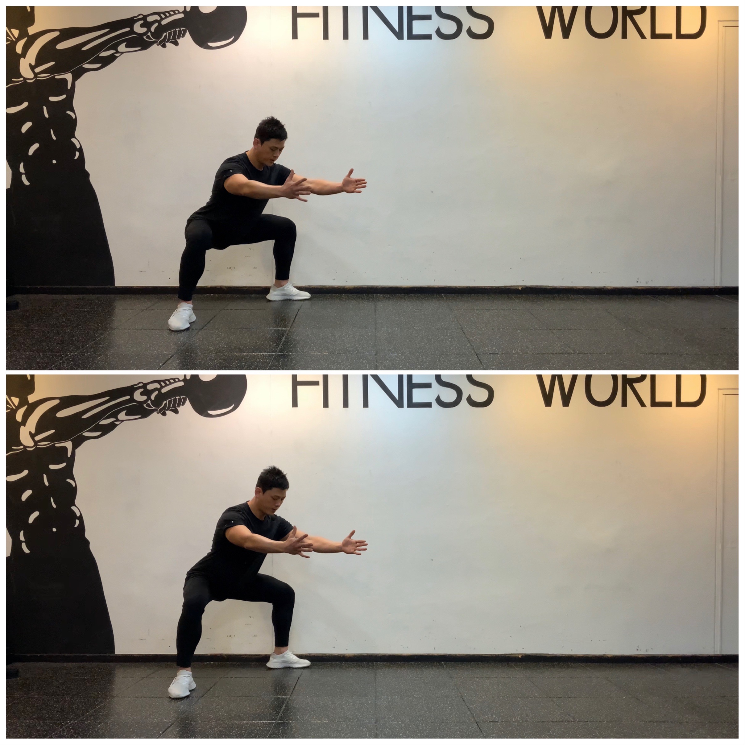 1. 다리는 어깨 너비보다 조금 좁게 벌리고 서서 가볍게 점프해 다리를 어깨 너비보다 조금 넓게 벌리며 앉는다. 이때 양손은 가슴 앞쪽으로 뻗는다.