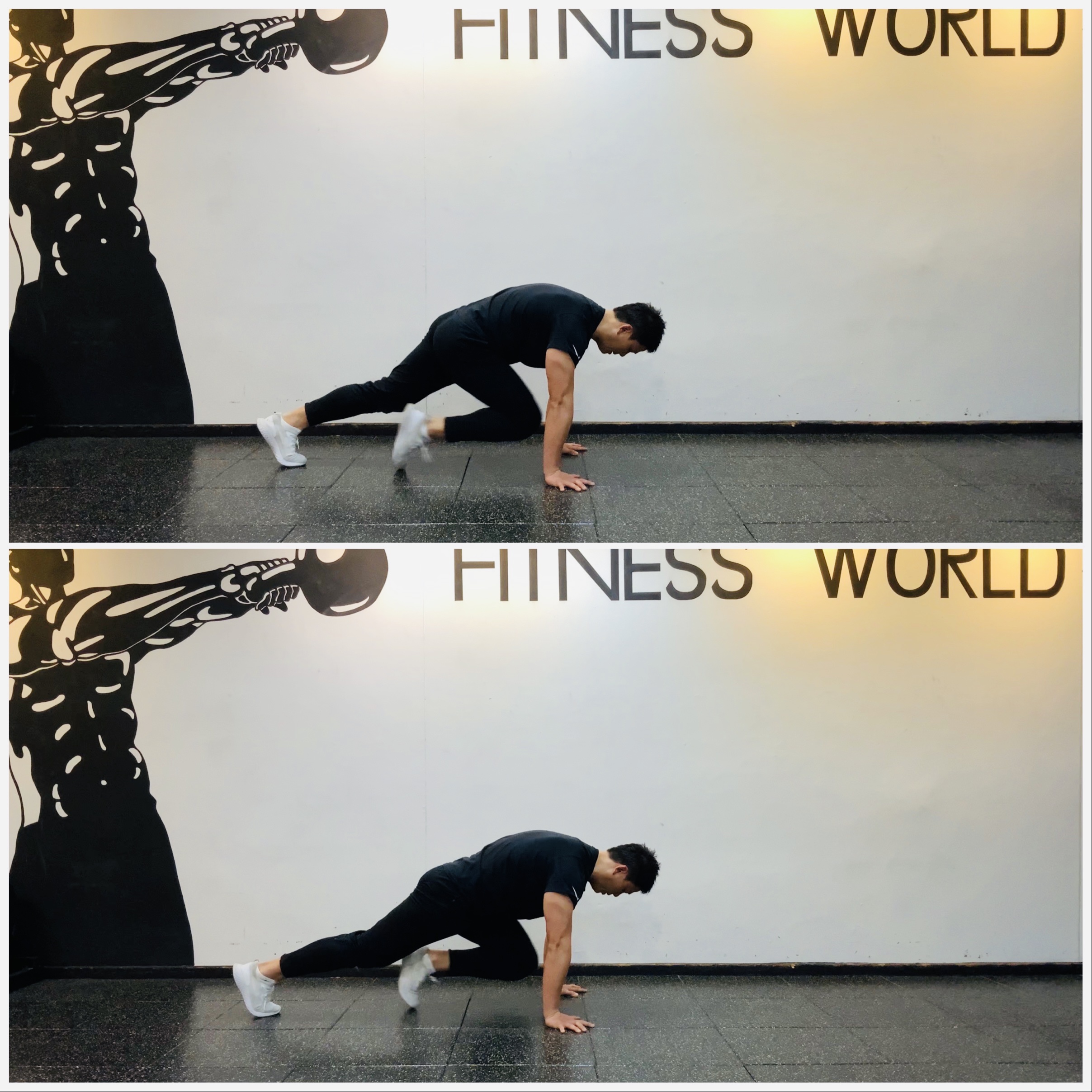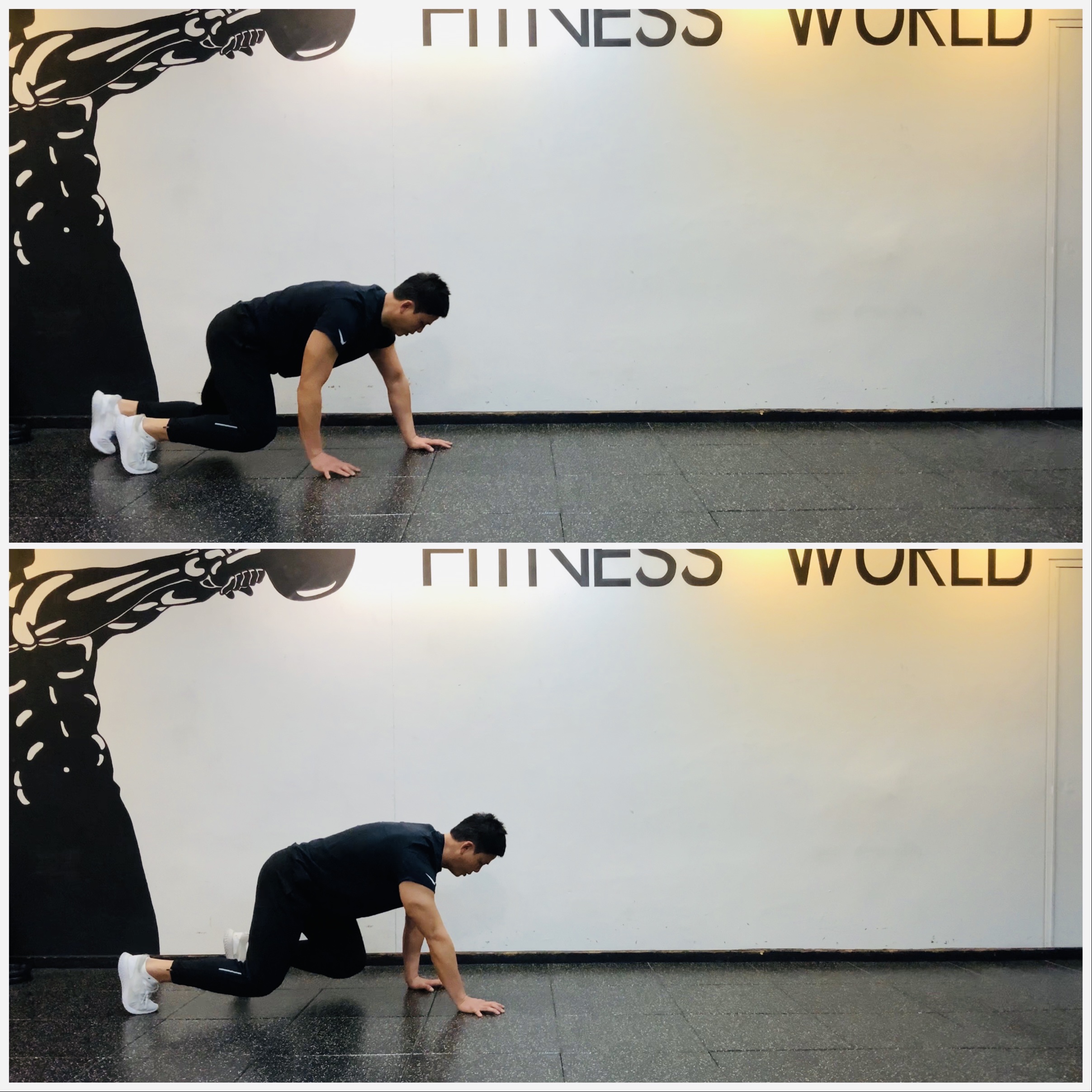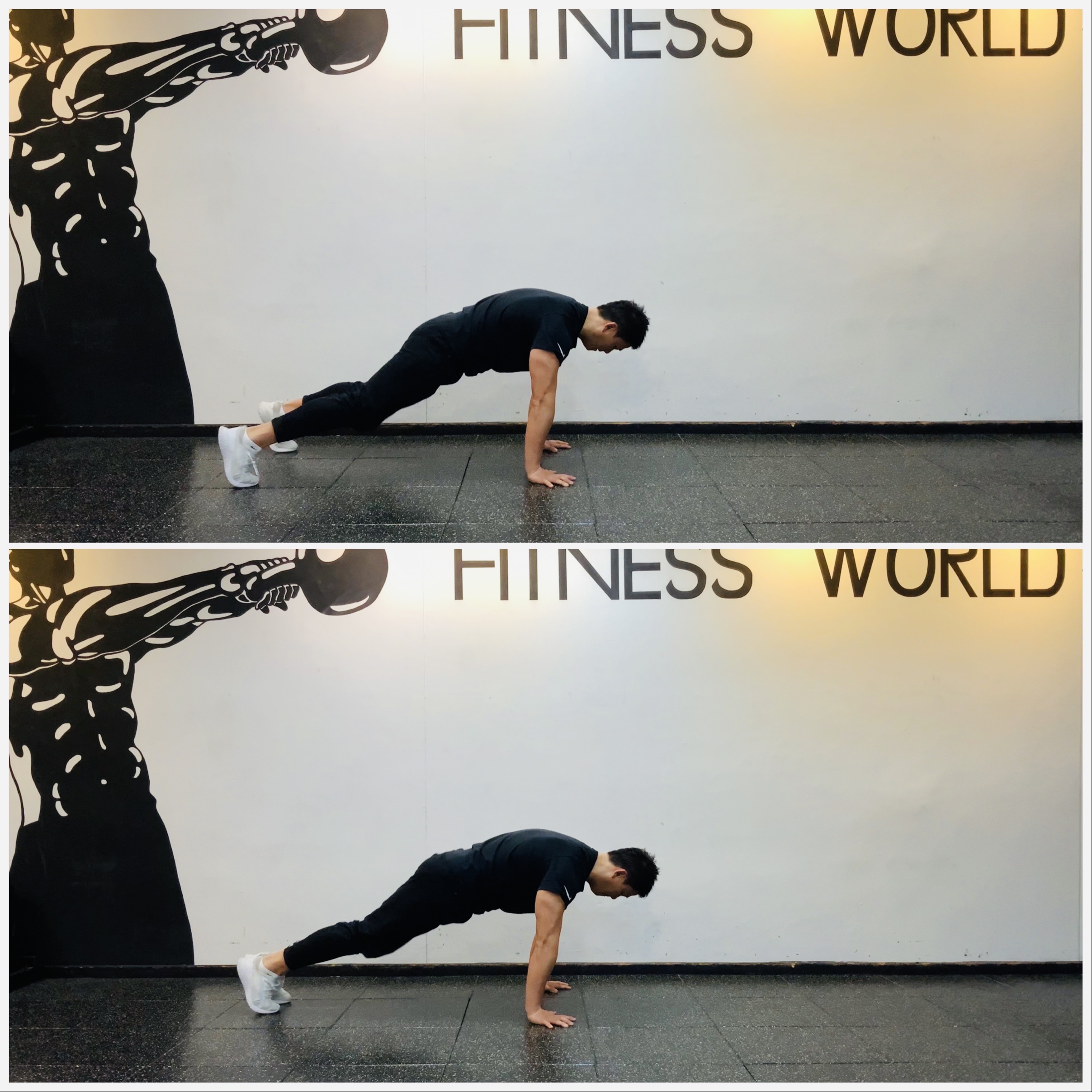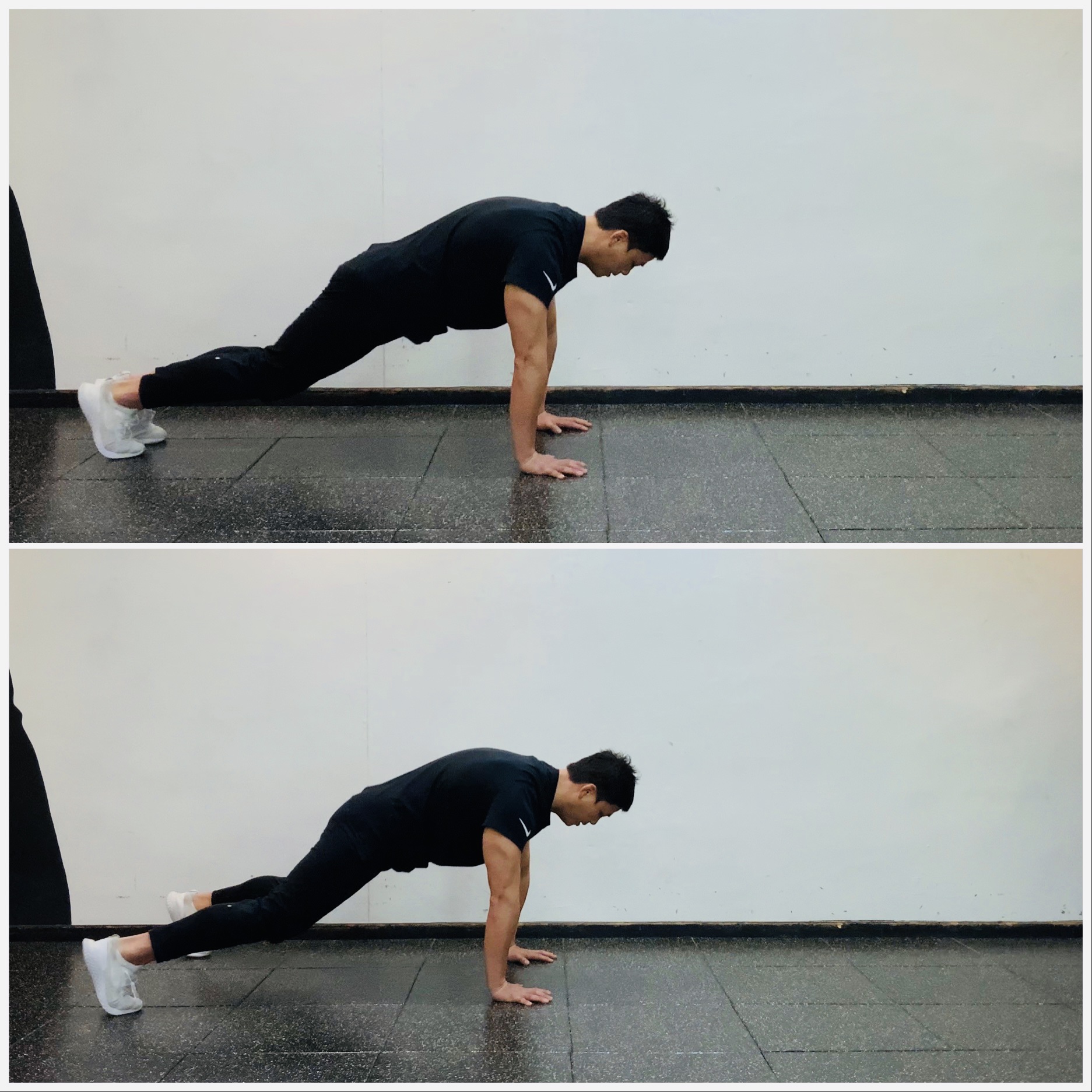 1. 양손은 어깨 아래 위치하고 하이 플랭크 포지션을 유지한다.