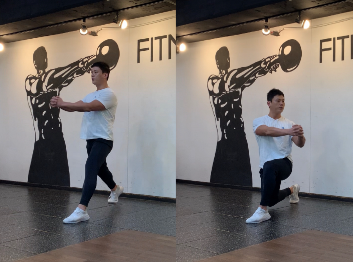 2. 양손은 허리에 위치하고 무릎과 고관절을 굽힘과 동서에 상체 중심은 앞으로 엉덩이 중심은 뒤로 향하게 한다.