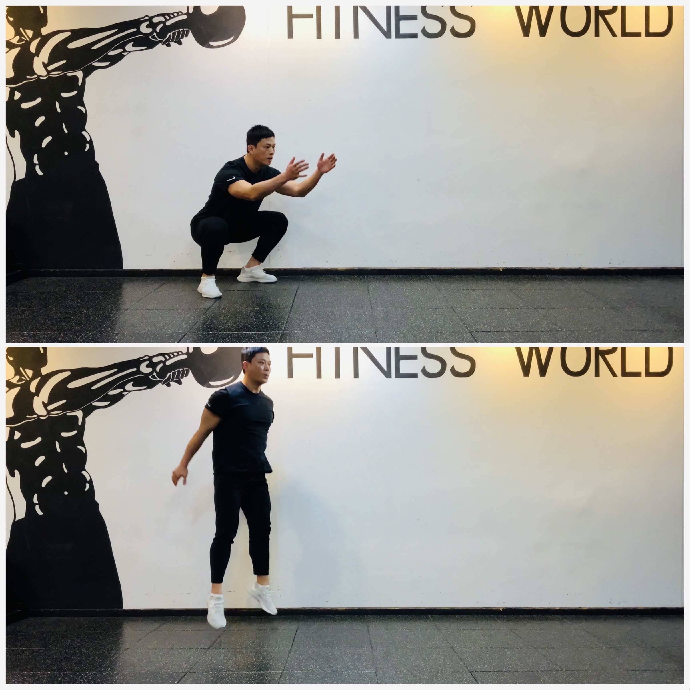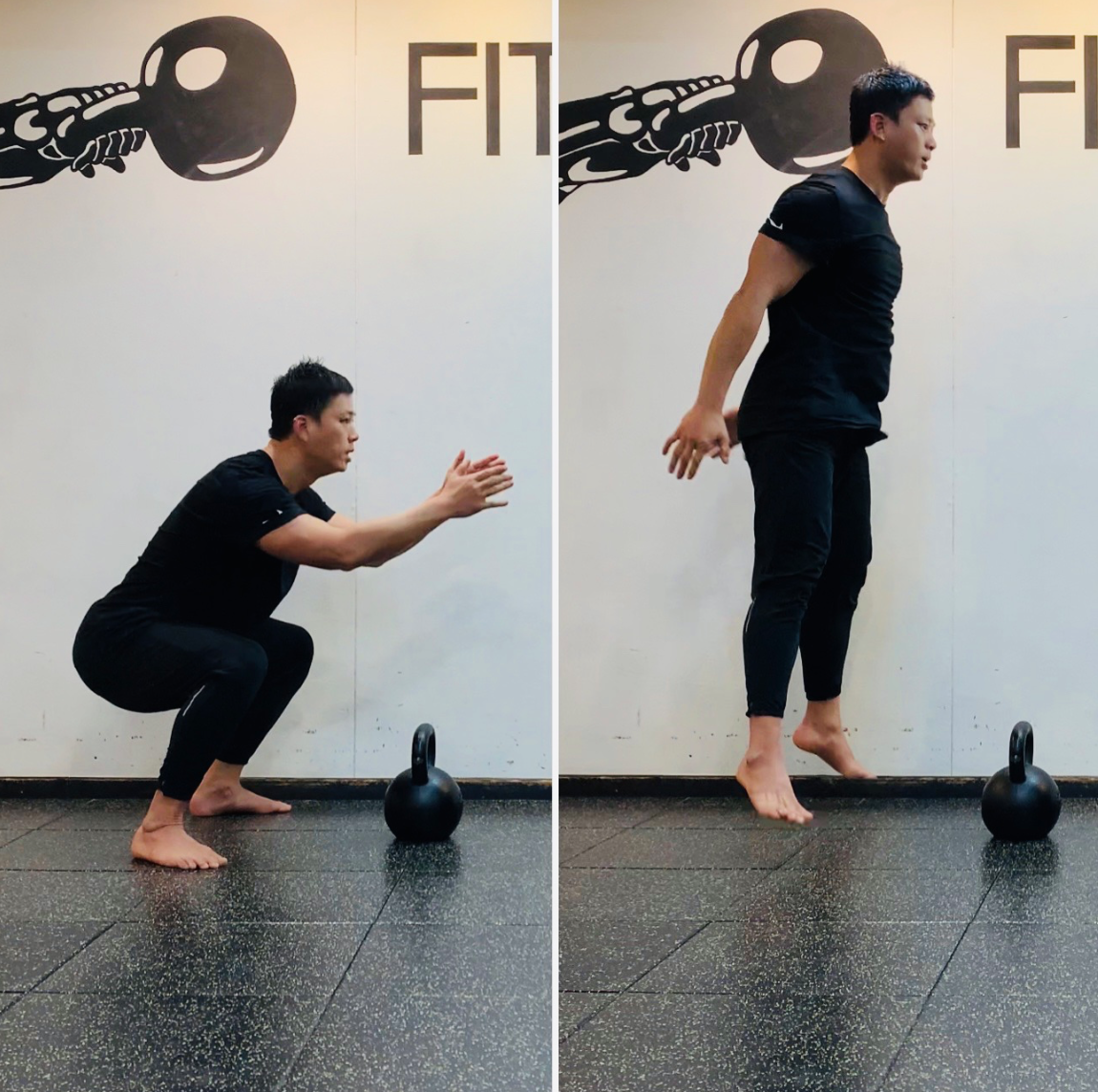 3. 척추의 정렬은 항상 유지하고 엉덩이가 무릎보다 낮은 곳에 왔을 때 호흡을 내쉬며 일어나 점프한 후 동작을 반복한다.