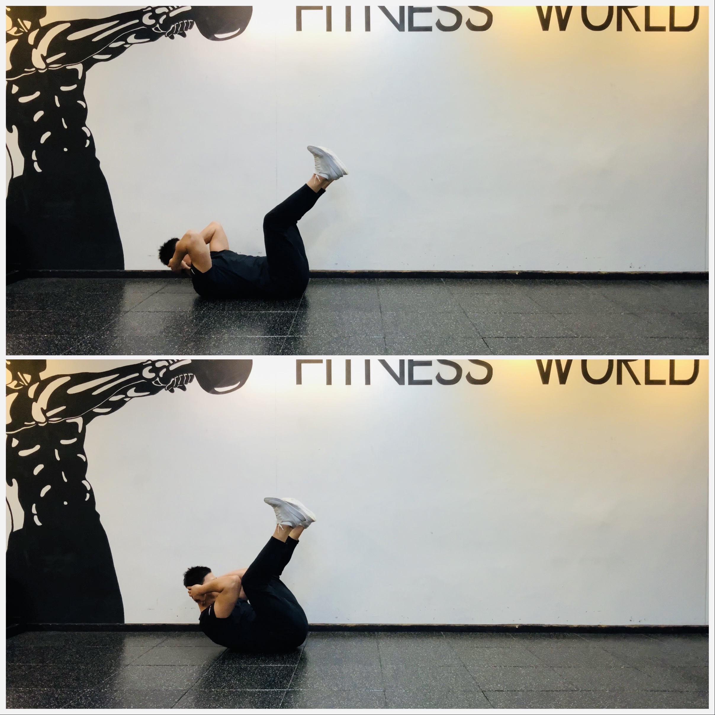 1. 바닥에 누워 양발은 45도 정면을 향하게 들고 복부에 힘을 줘 상체를 들어 올린다.