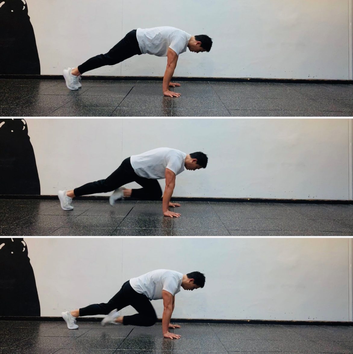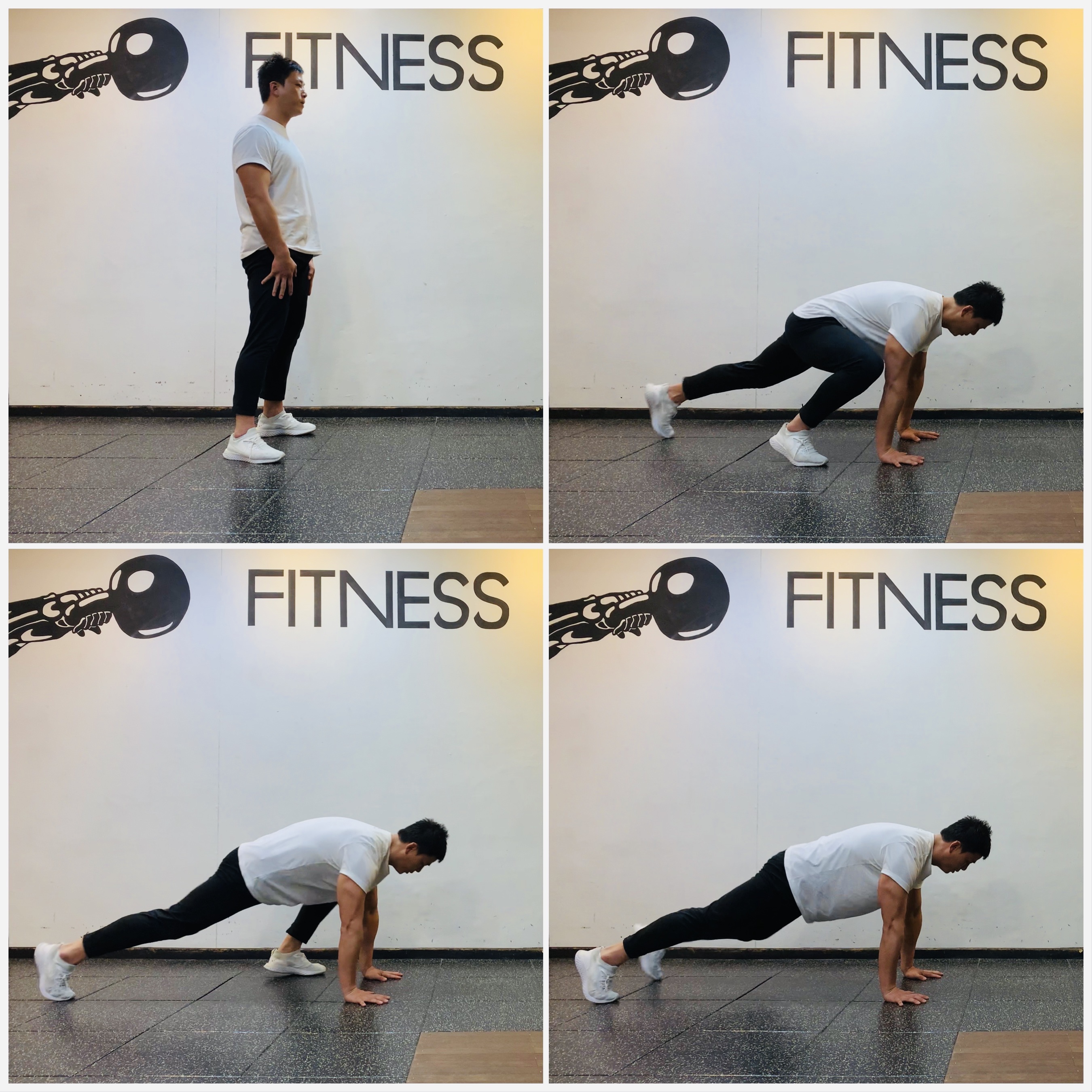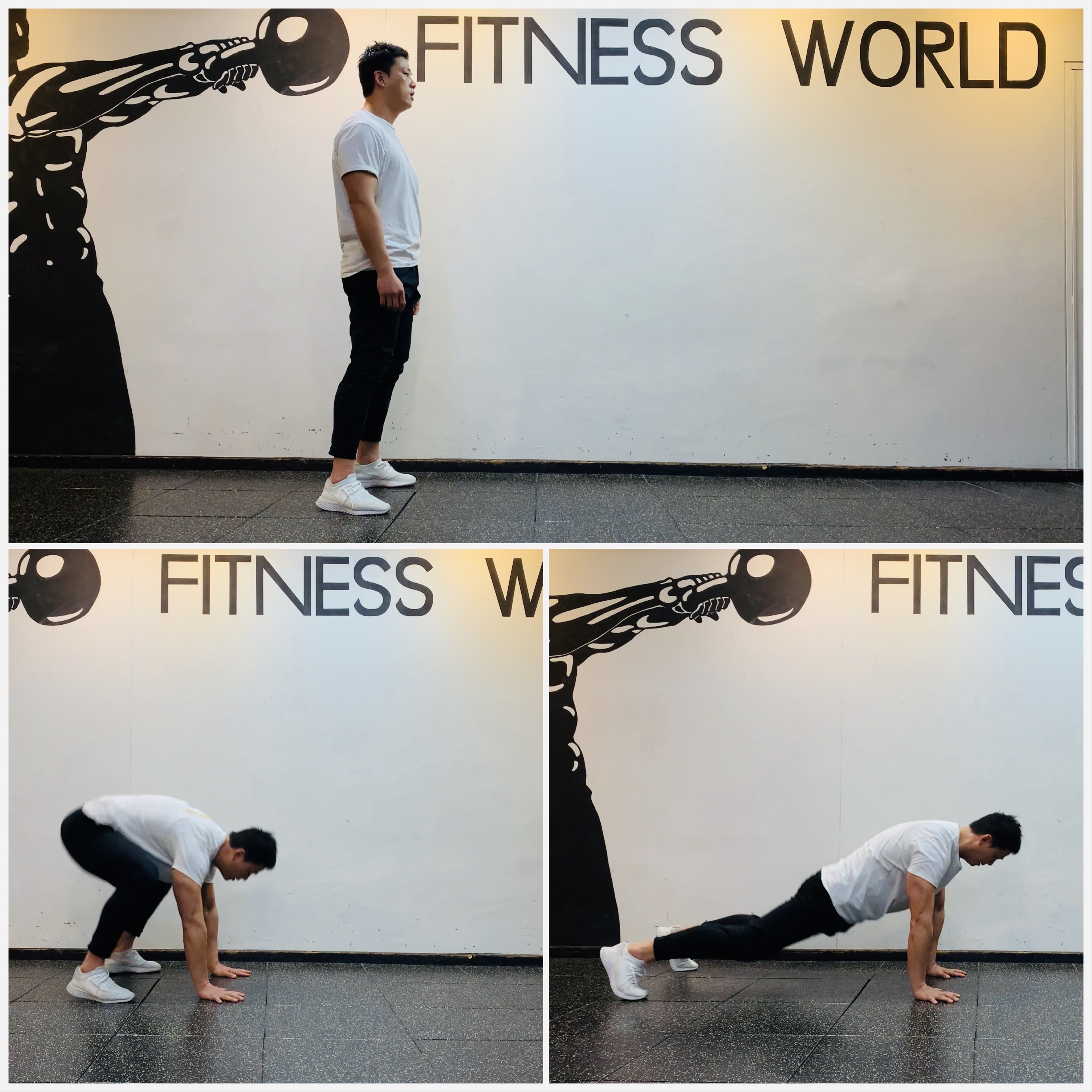 3. 한 발씩 뒤쪽으로 뻗어 하이 플랭크 자세를 만들고 다시 시자 자세로 돌아가 동작을 반복한다.
