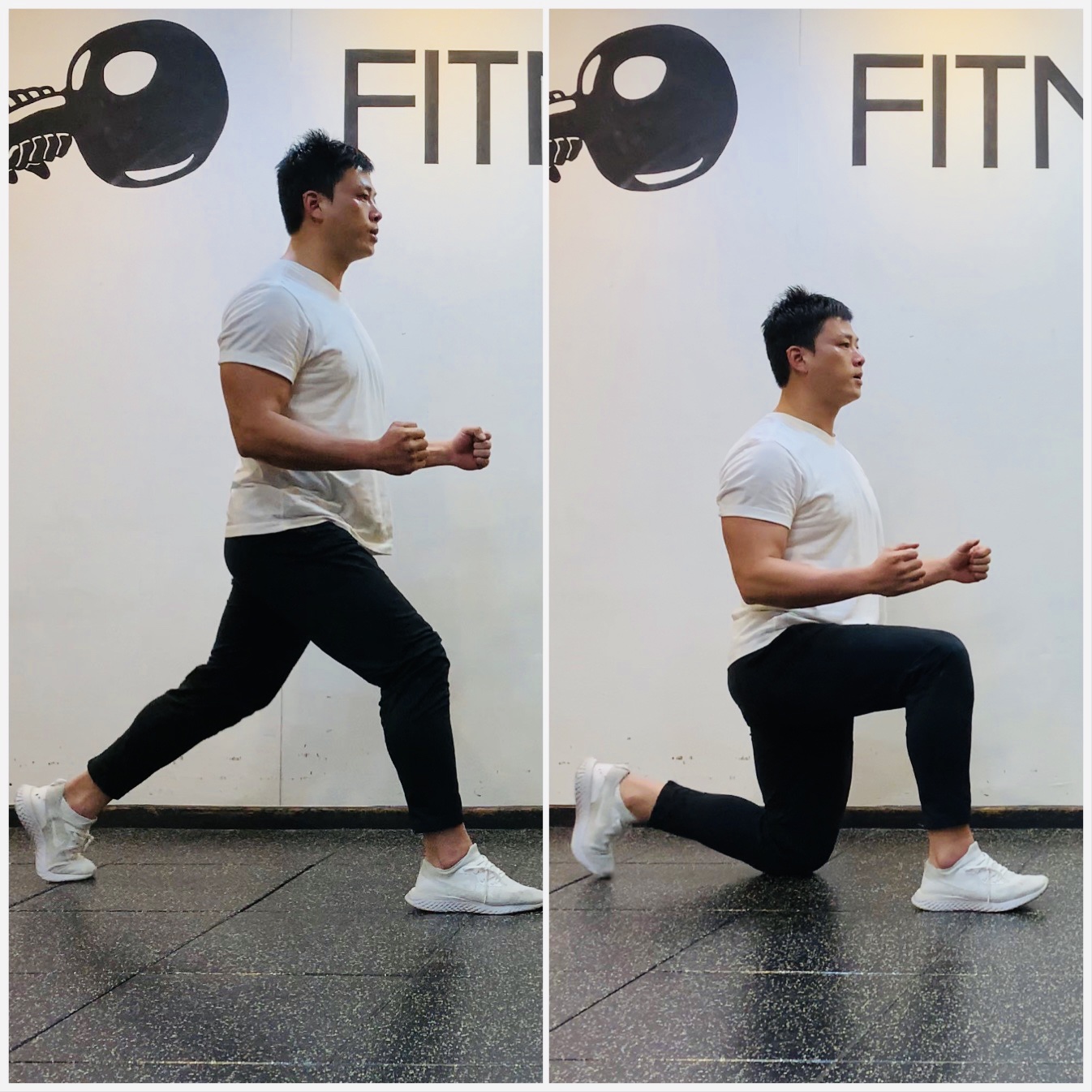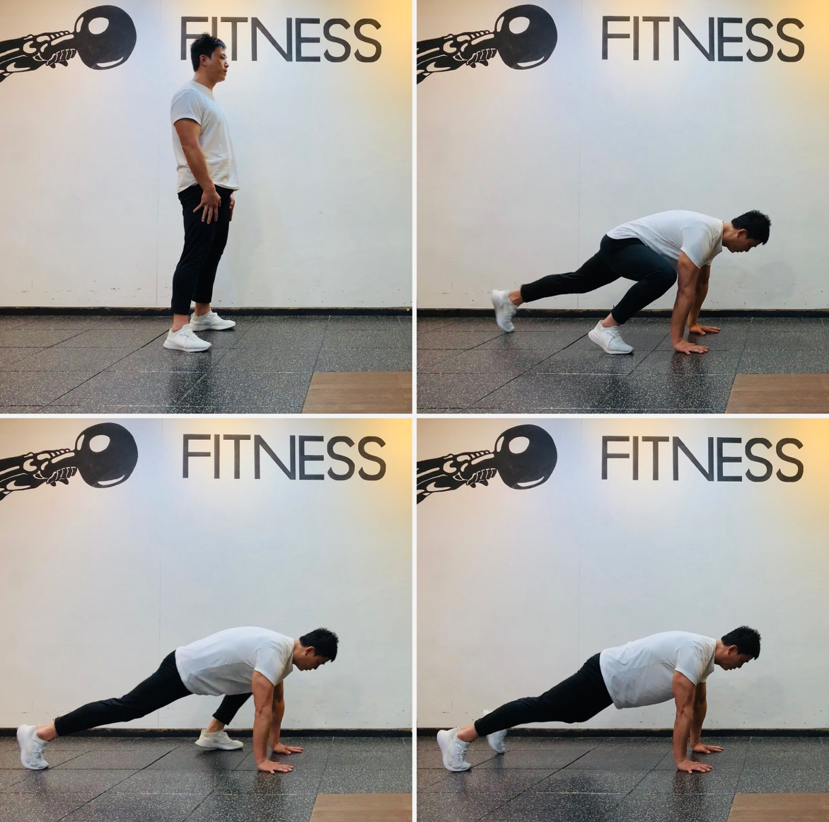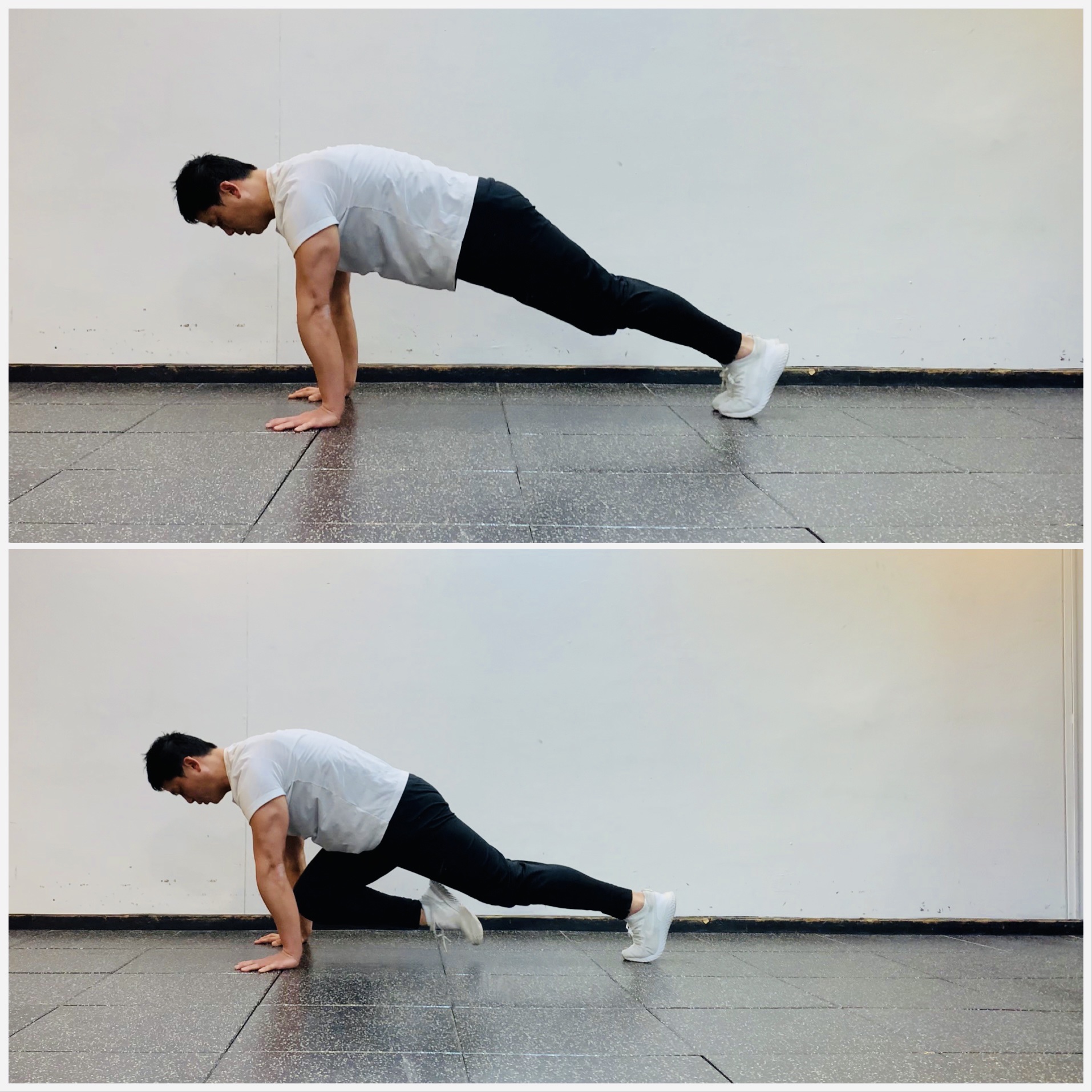 오늘 실시할 동작은 싯 쓰루 니 동작과 하이 플랭크 포지션 프론트 스텝 동작인데요~