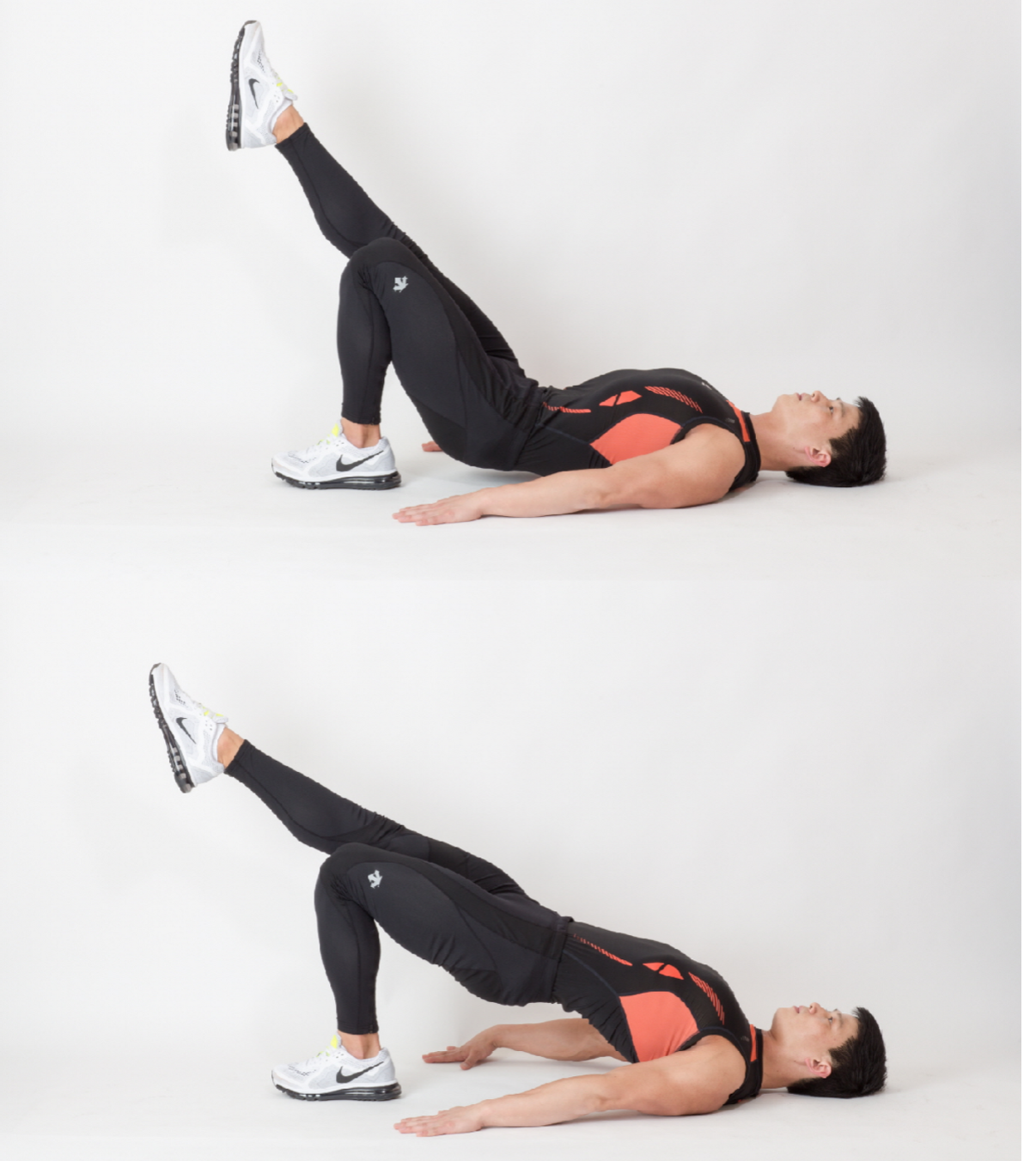 2. 호흡을 내쉬며 어깨와 엉덩이를 동시에 바닥에서 들어 상체와 하체를 모아 복직근을 수축시킨 뒤 천천히 시작 자세로 돌아와 동작을 반복한다.