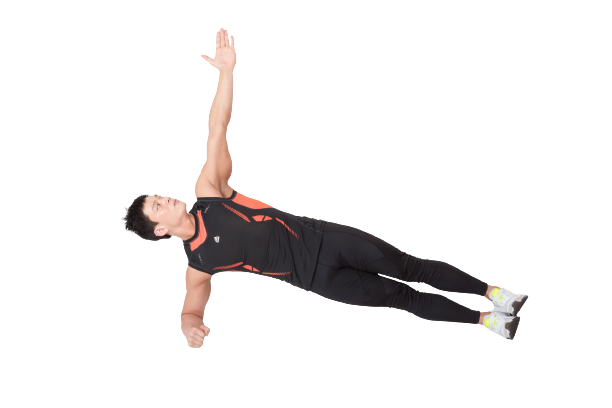3. 왼팔은 하늘을 향하하고 지지하는 팔은 지면을 밀어 어깨와 귀가 멀어지도록 한다.