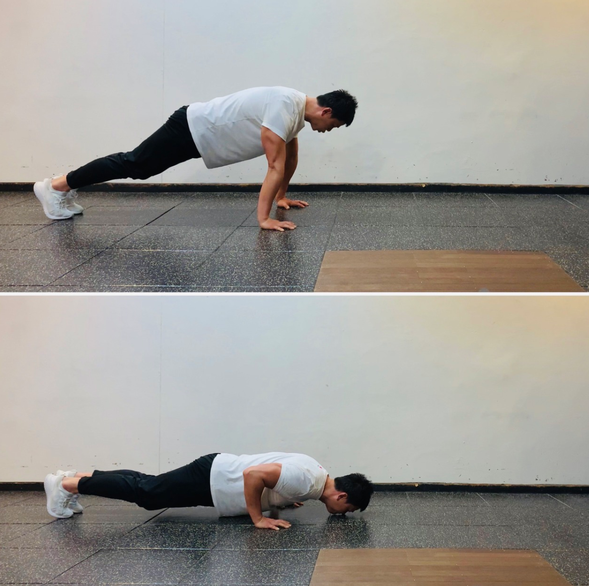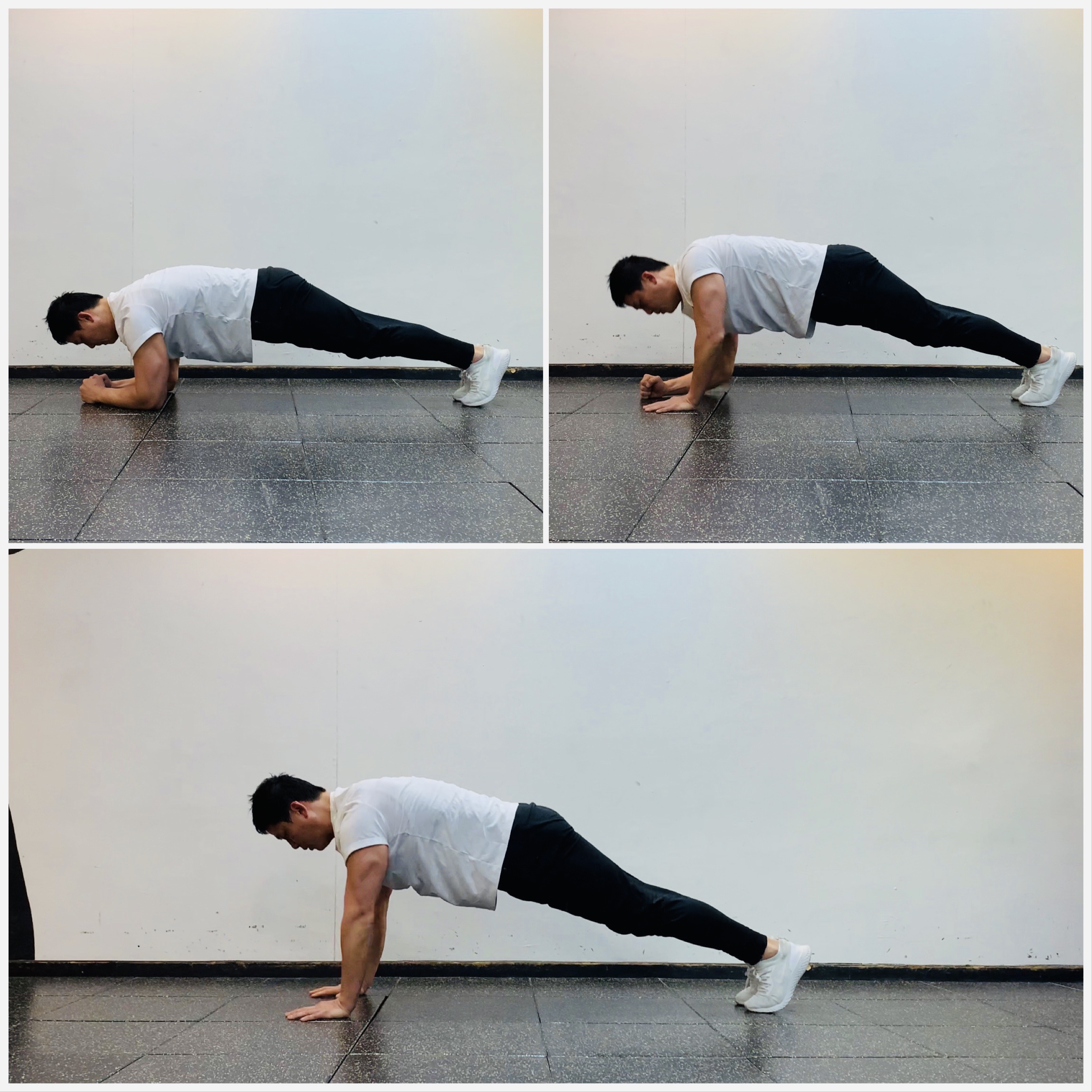 1. 양손은 어깨 아래 위치하고 하이 플랭크 포지션을 잡는다.