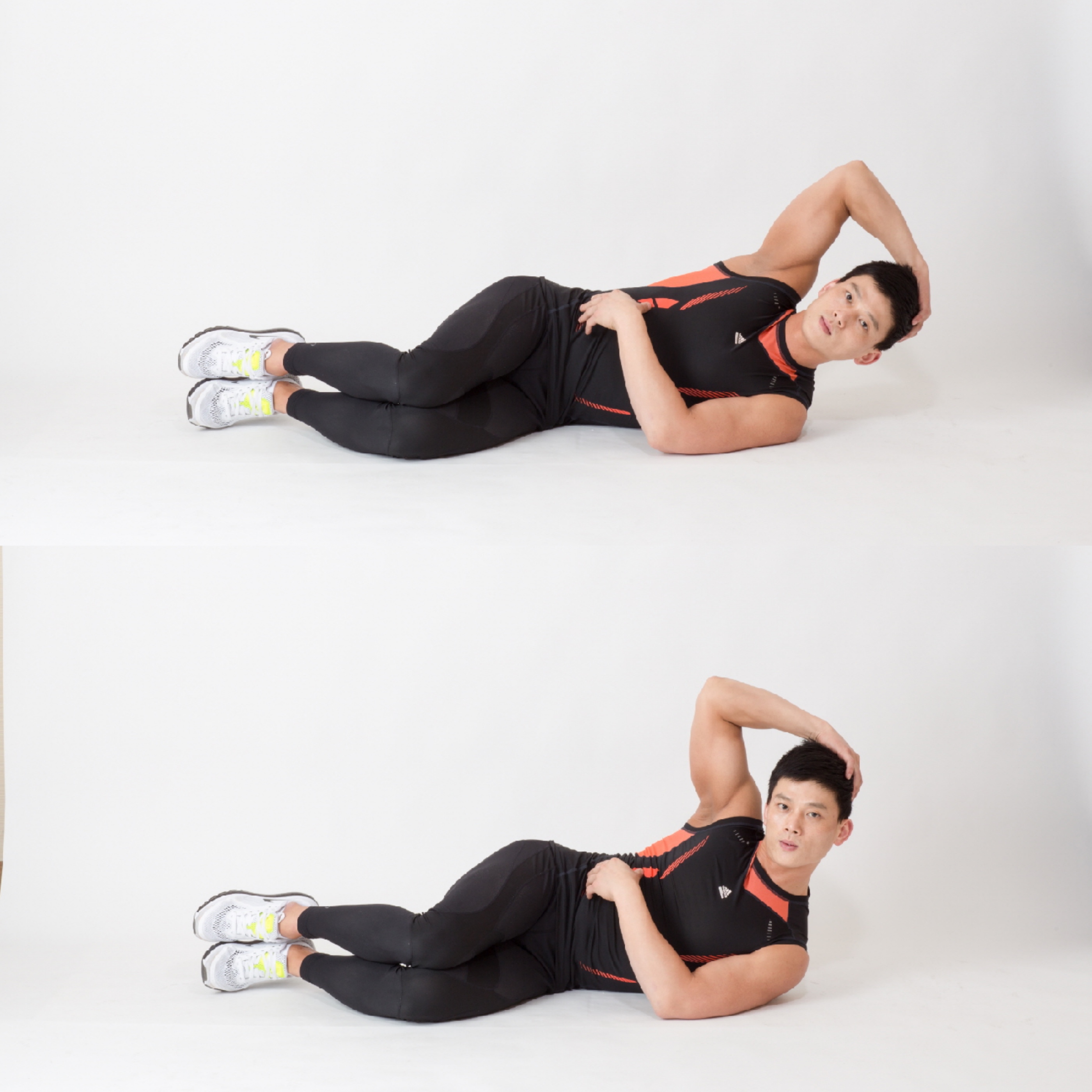 4. 다시 몸을 비틀어 왼쪽 어꺠를 들면서 오른쪽 무릎을 몸 쪽으로 당겨 동작을 반복한다.
