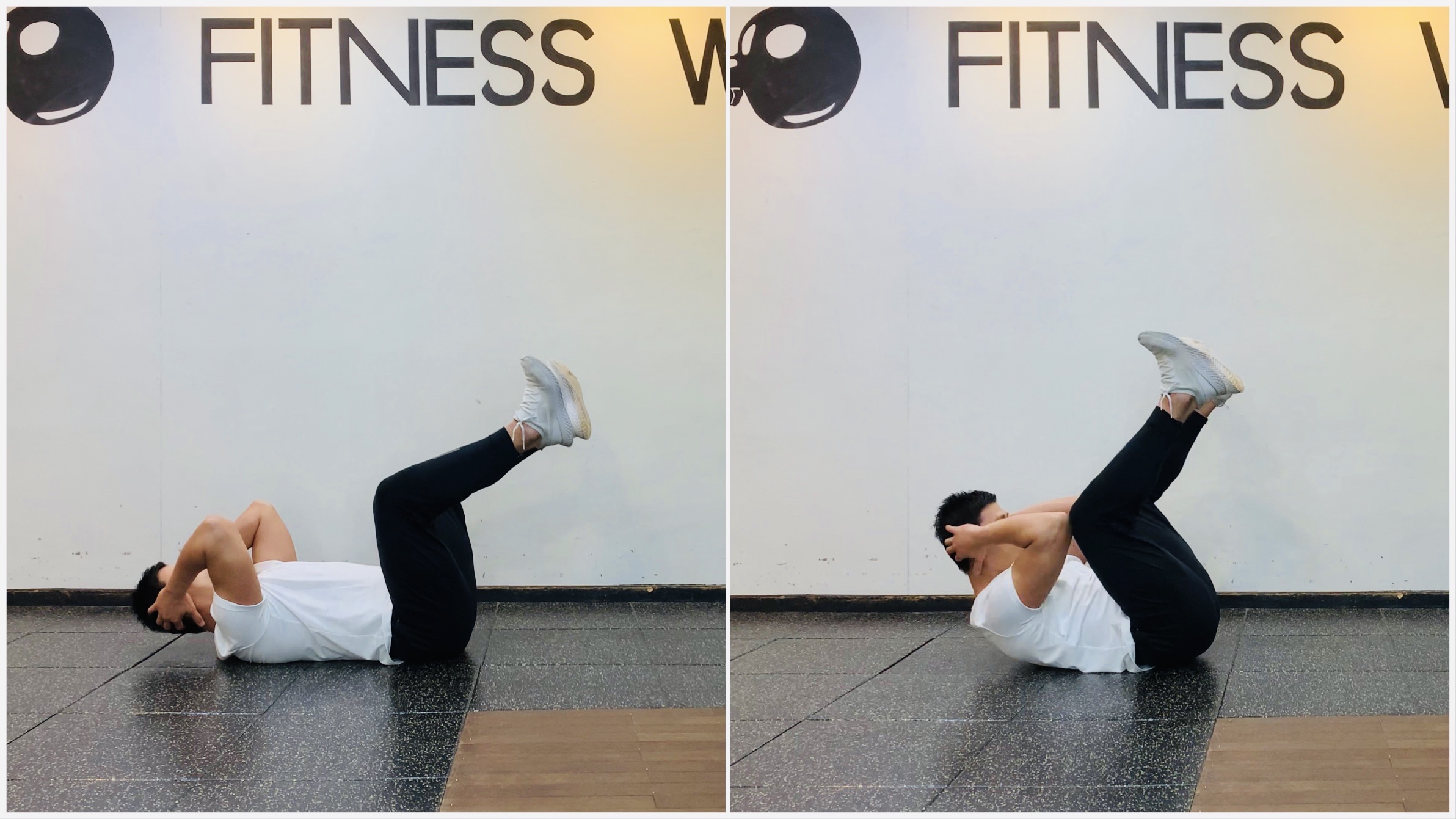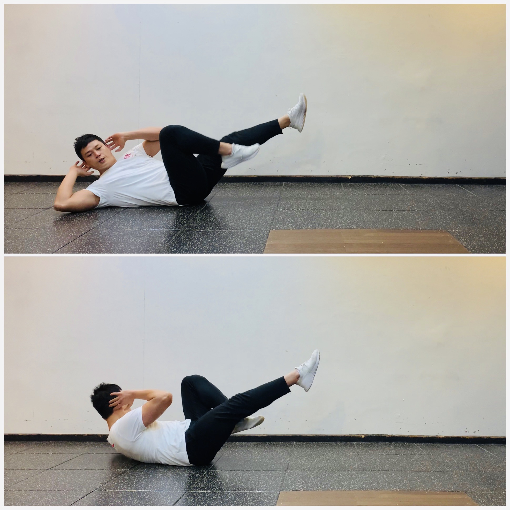 3. 호흡을 내쉬며 어꺠와 엉덩이를 동시에 바닥에서 들어 상체와 하체를 모아 복직근을 수축시킨 뒤 천천히 시작 자세로 돌아와 동작을 반복한다.
