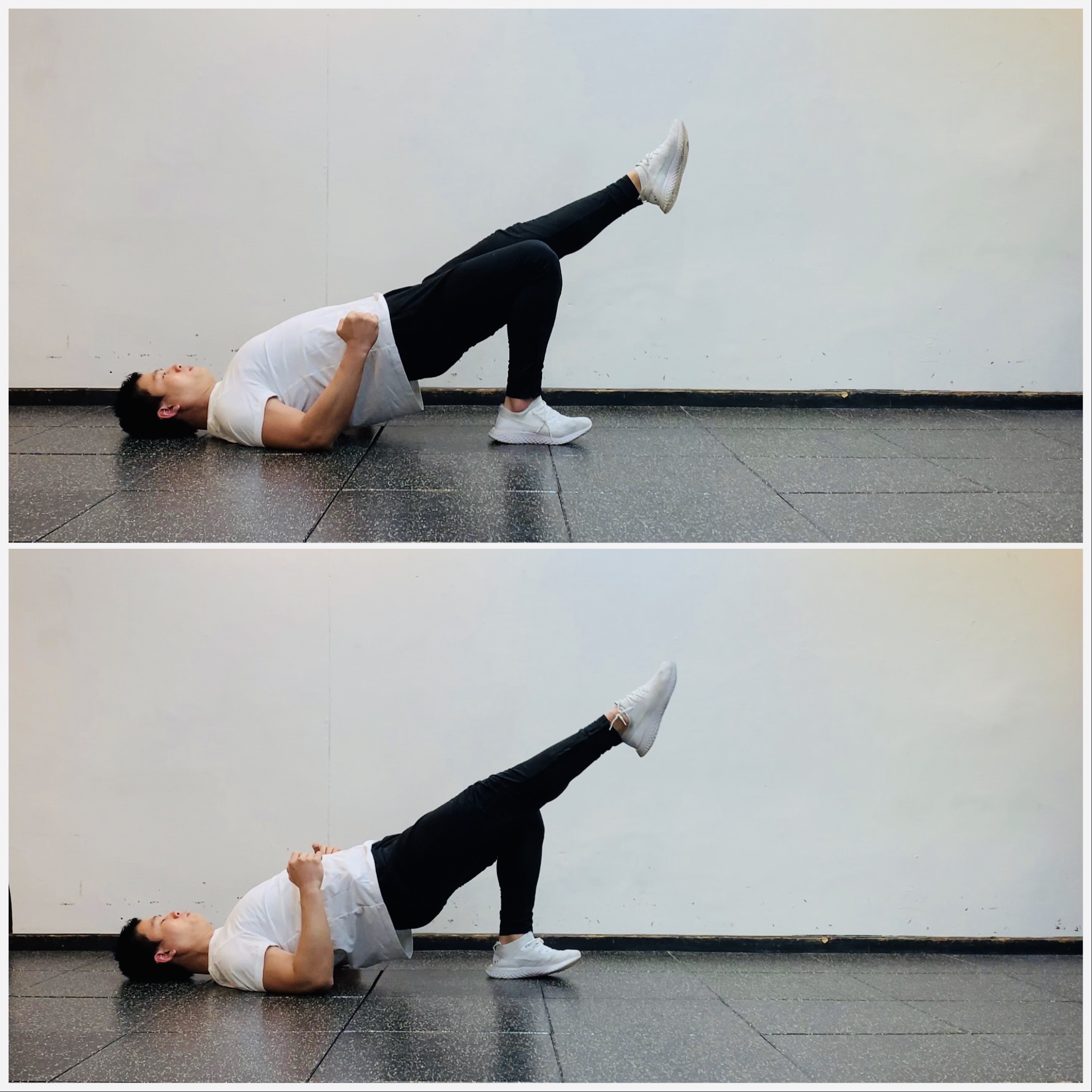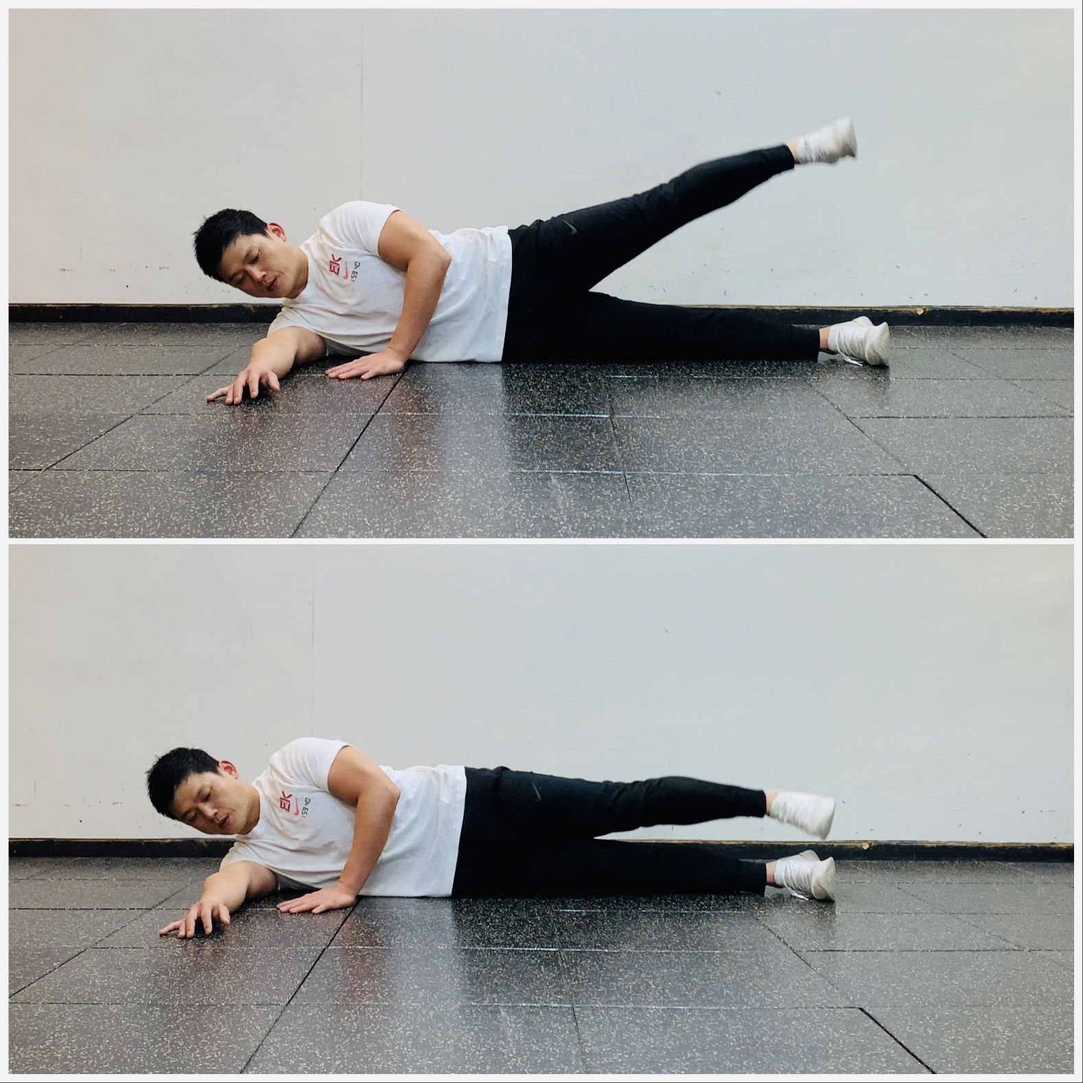 2. 몸통에 힘을 줘 골반을 들어 올림과 동시에 위쪽 다리도 들어 올린다.
