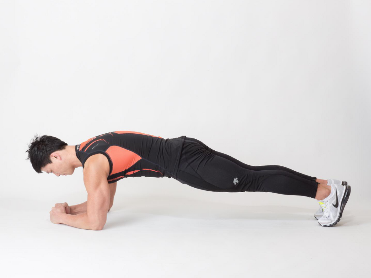 2. 몸에 힘을 줘 복사뼈부터 어깨까지 일직선이 되도록 한다.