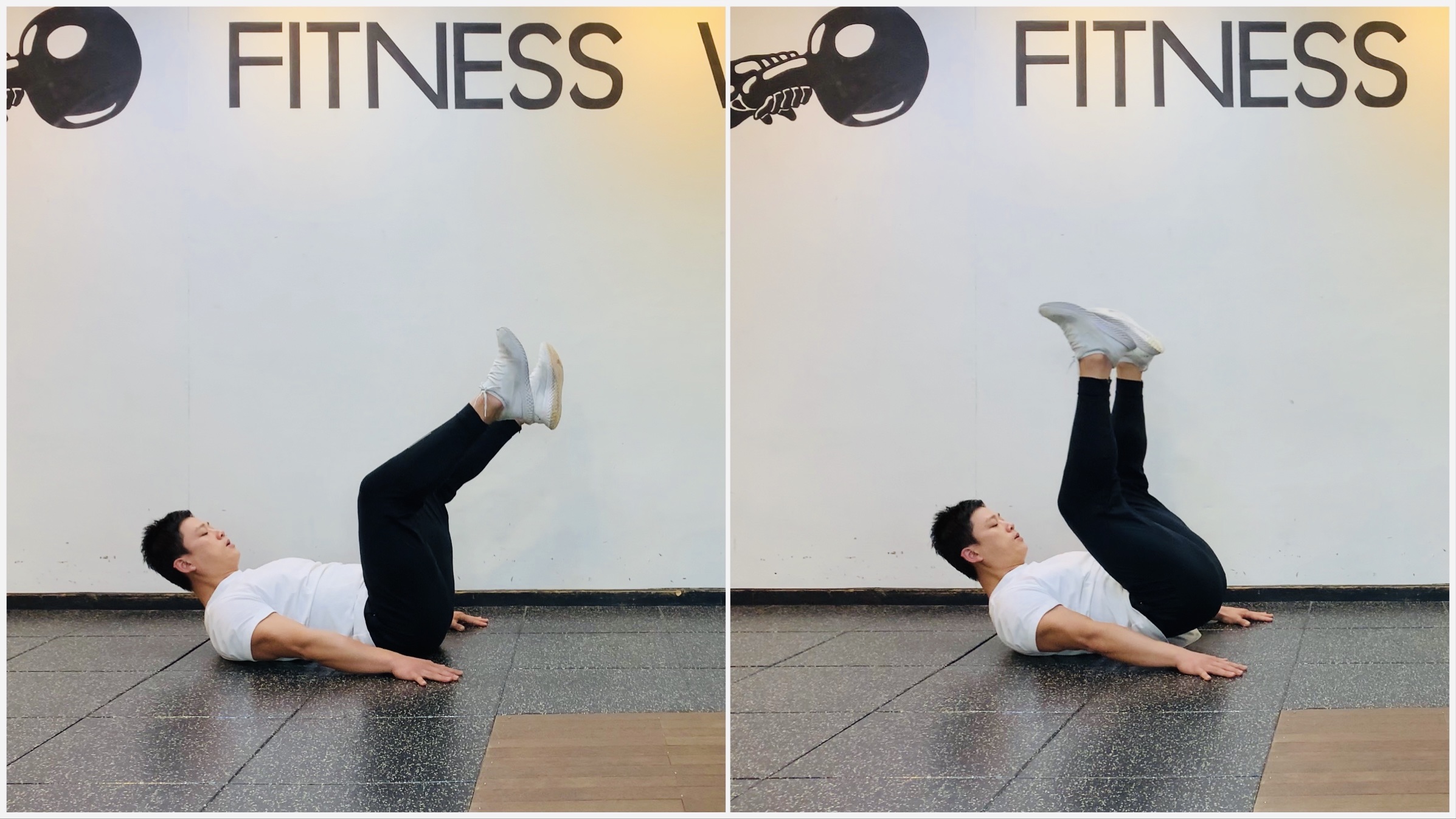 3. 호흡을 내쉬며 어꺠와 엉덩이를 동시에 바닥에서 들어 상체와 하체를 모아 복직근을 수축시킨 뒤 천천히 시작 자세로 돌아와 동작을 반복한다.