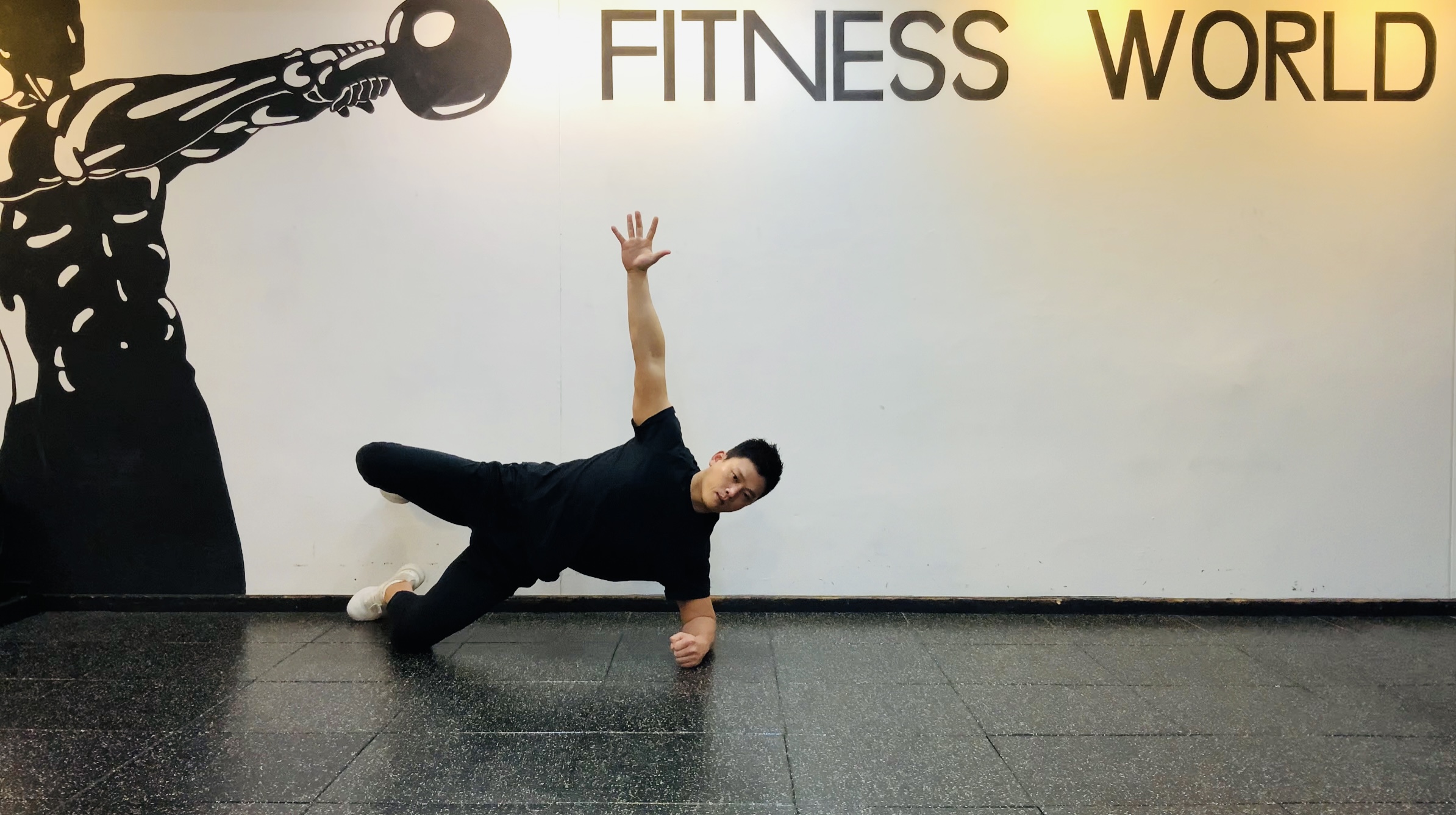 2. 왼쪽 옆구리 쪽에 수축을 느끼며 골반을 들고 오른쪽 다리도 들어준다. 이때 오른쪽 팔은 왼쪽 팔꿈치와 최대한 멀어지도록 하늘을 향한다.
