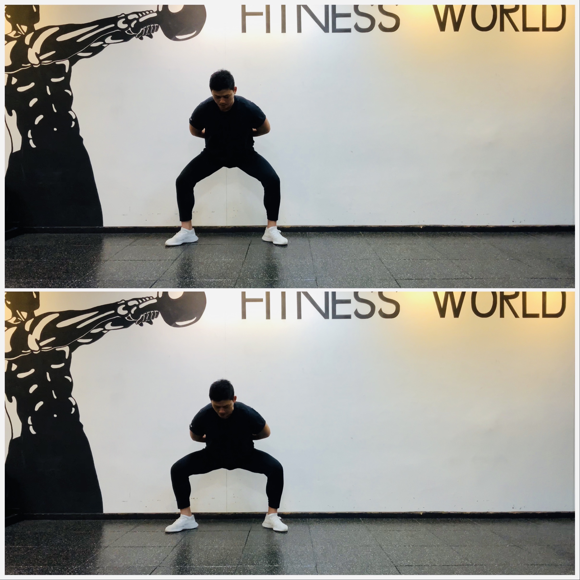 2. 무릎과 고관절을 굽혀 엉덩이가 무릎 위치에 올 때까지 앉는다. 이때 양손은 가슴 앞으로 뻗는다.
