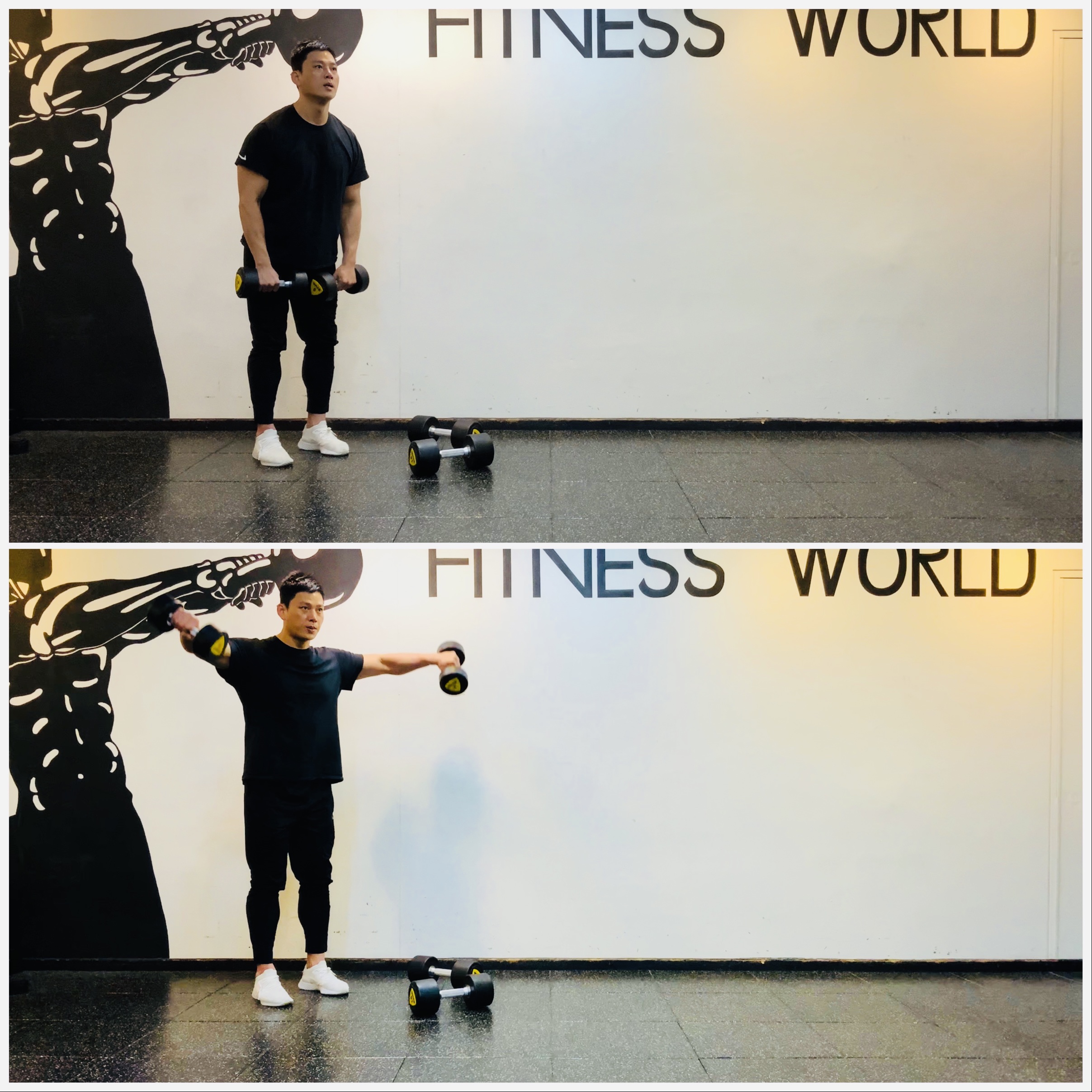3. 호흡을 내쉬며 양팔을 측면으로 들어 올리는데 이때 팔꿈치가 몸통 앞선에 맞춰지게 들어 올린다.