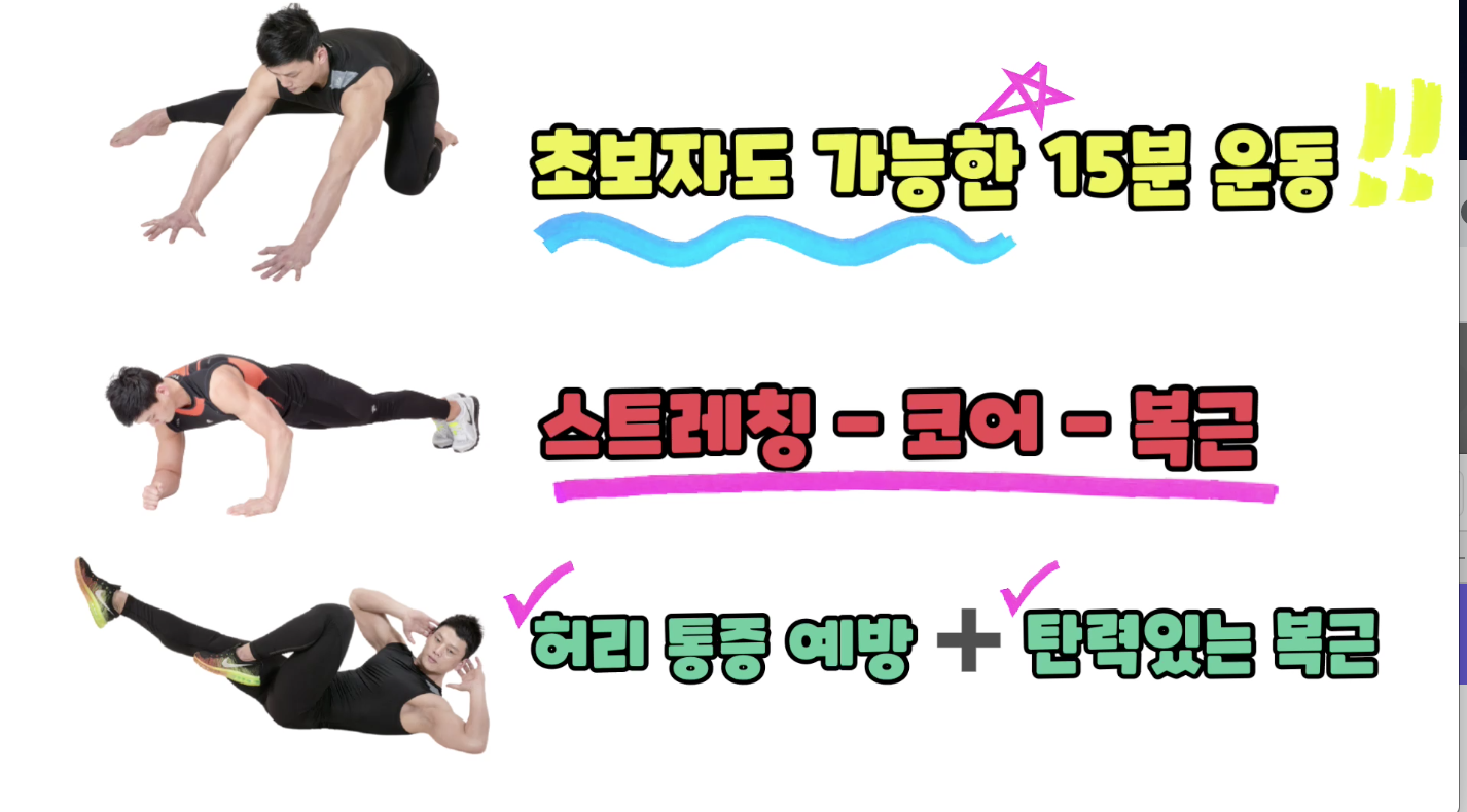 소개할 운동은 총 3가지 챕터로 진행되며 챕터 1에서는 허리 통증 예방을 위한 스트레칭, 챕터 2에서는 코어 활성화를 위한 운동, 챕터 3에서는 타바타 음원에 맞춰 4분 복근 운동 순서로 진행됩니다.