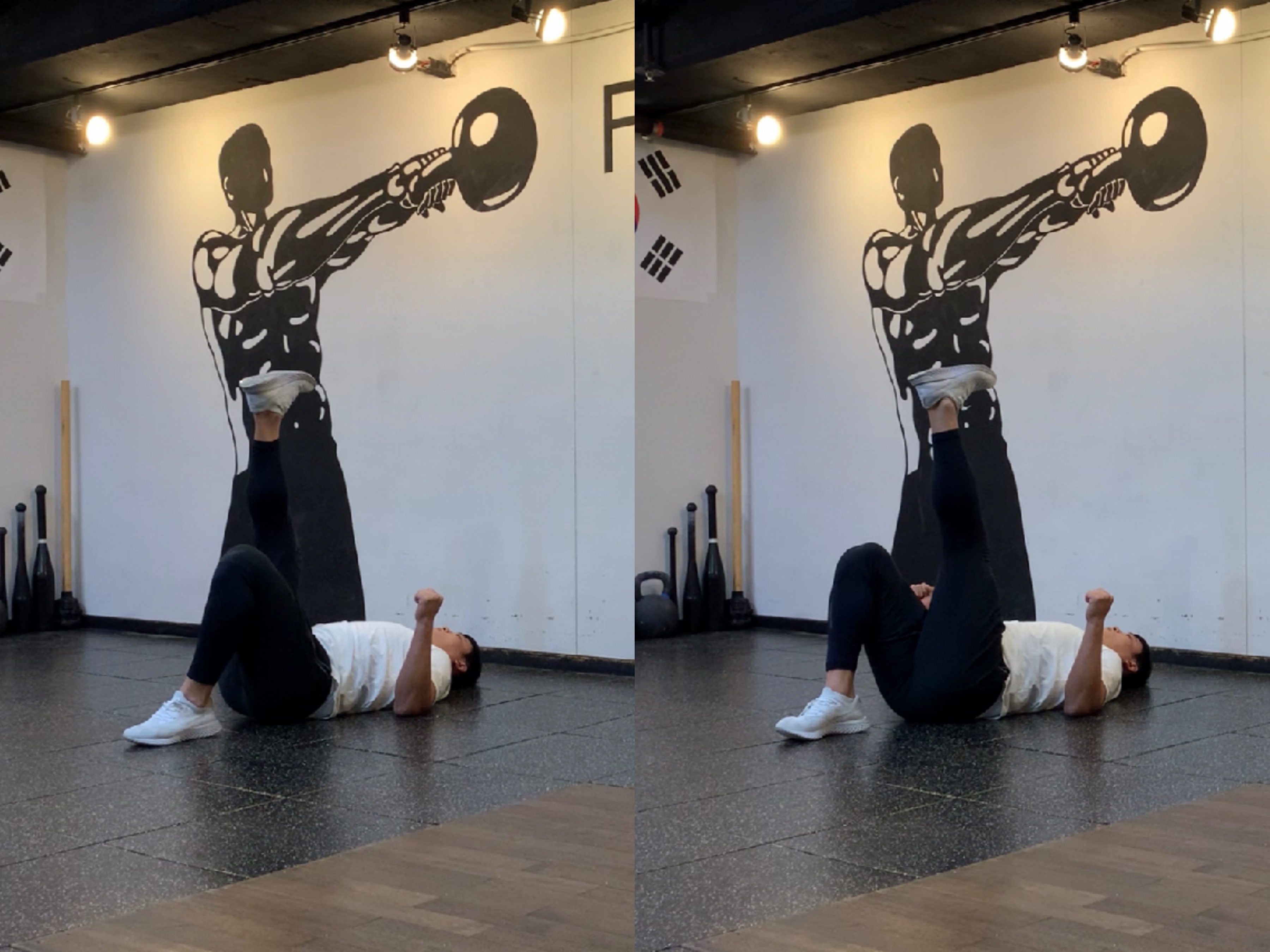 2. 고관절 굴곡근과 복부의 수축을 느끼고 천천히 시작 자세로 돌아간다.