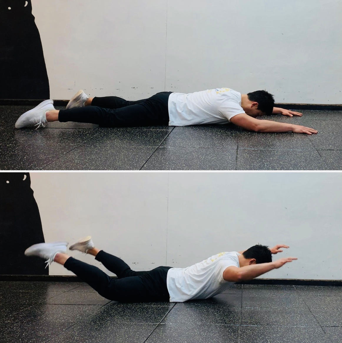 1. 지면에 배 대고 엎드려 양손은 머리 위쪽으로 뻗어둔다.