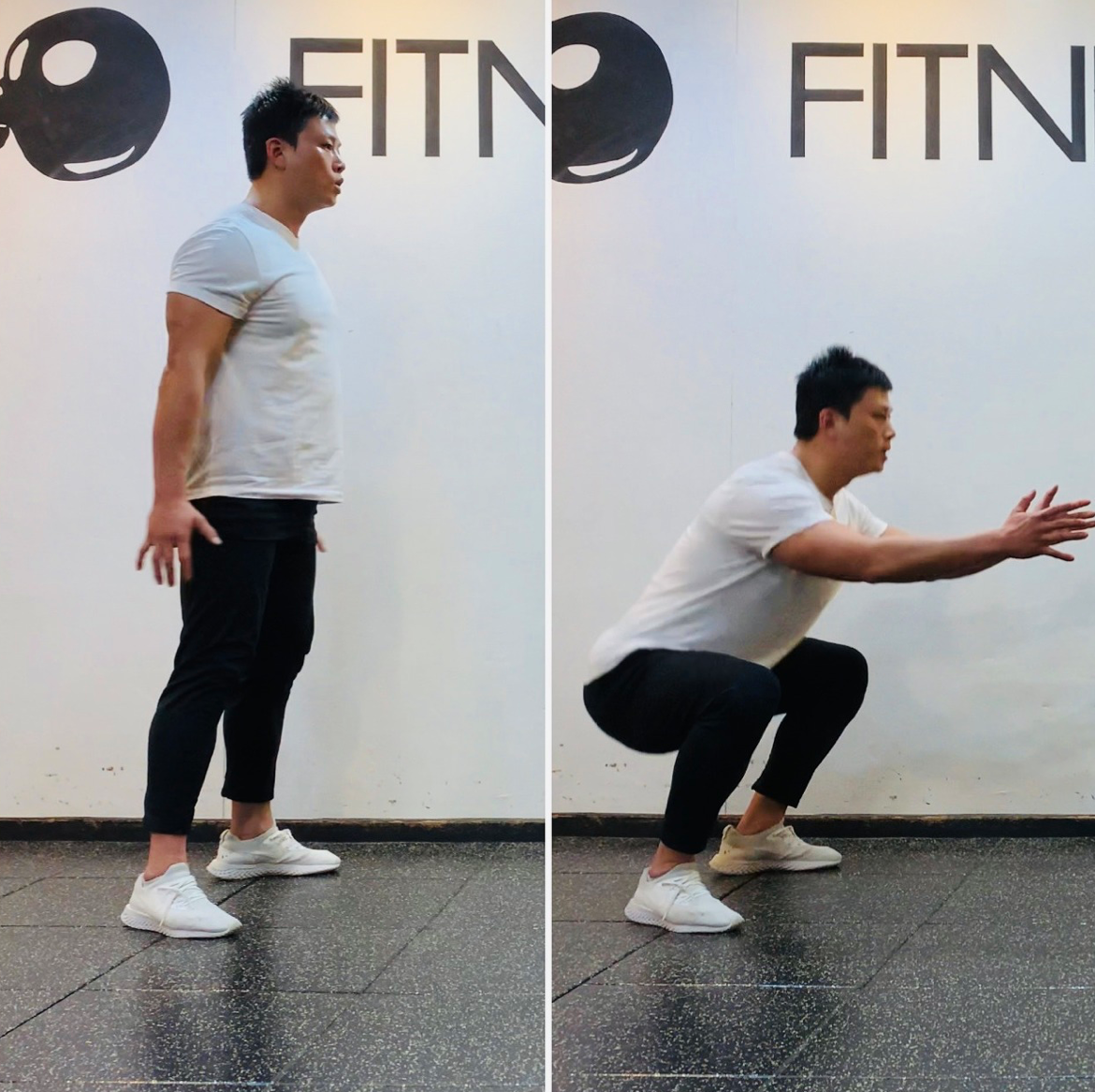 3. 엉덩이가 무릎보다 낮아지면 호흡을 내쉬며 시작 자세로 돌아와 동작을 반복한다.