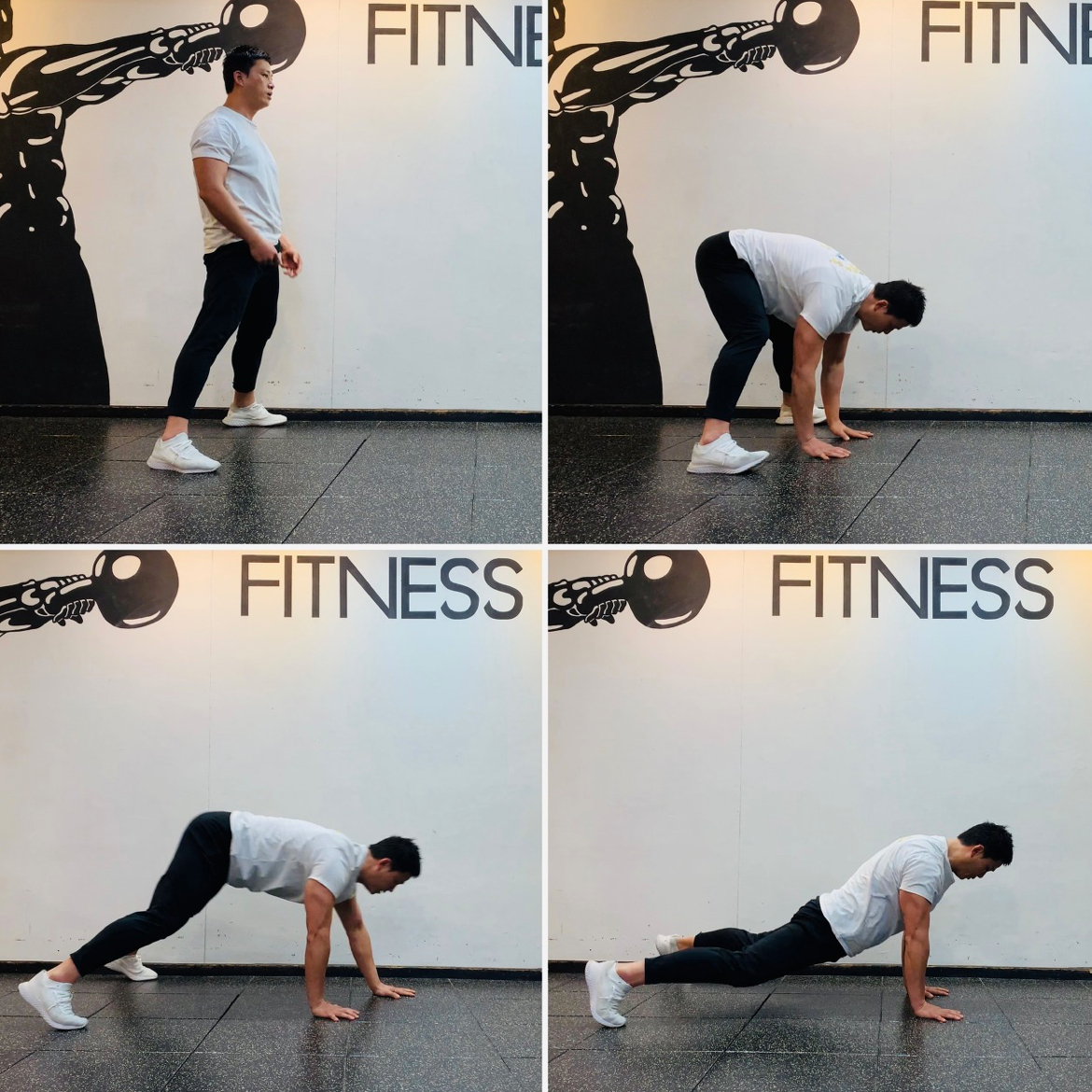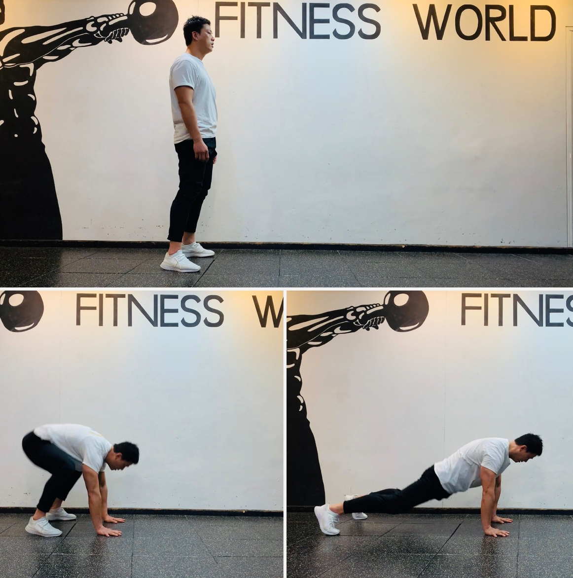 3. 한 발씩 뒤쪽으로 뻗어 하이 플랭크 자세를 만들고 다시 시작 자세로 돌아가 동작을 반복한다.