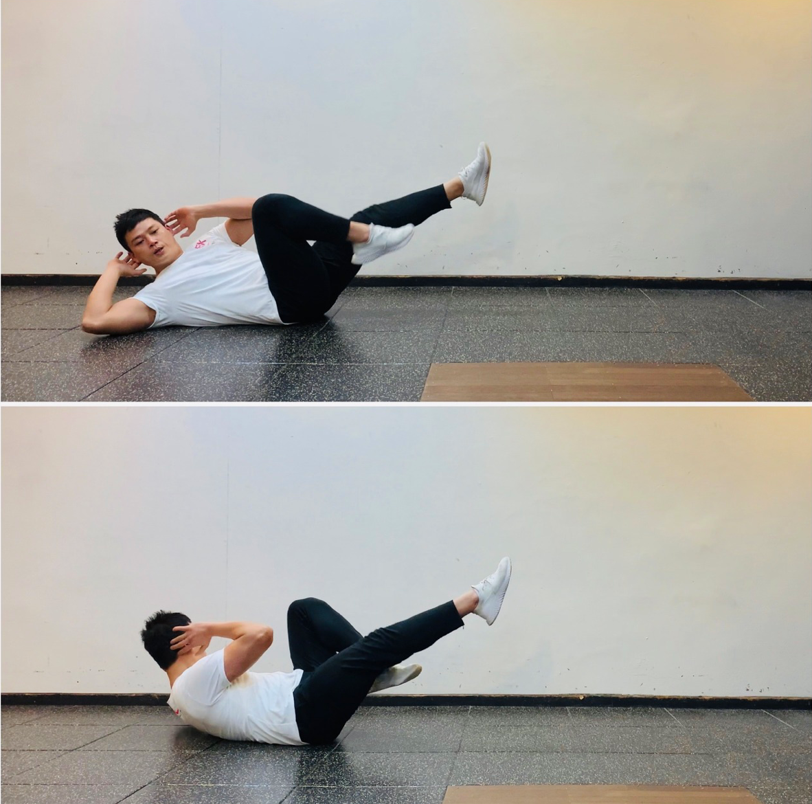 4. 다시 몸을 비틀어 왼쪽 어깨를 들면서 오른쪽 무릎을 몸 쪽으로 당겨 동작을 반복한다.