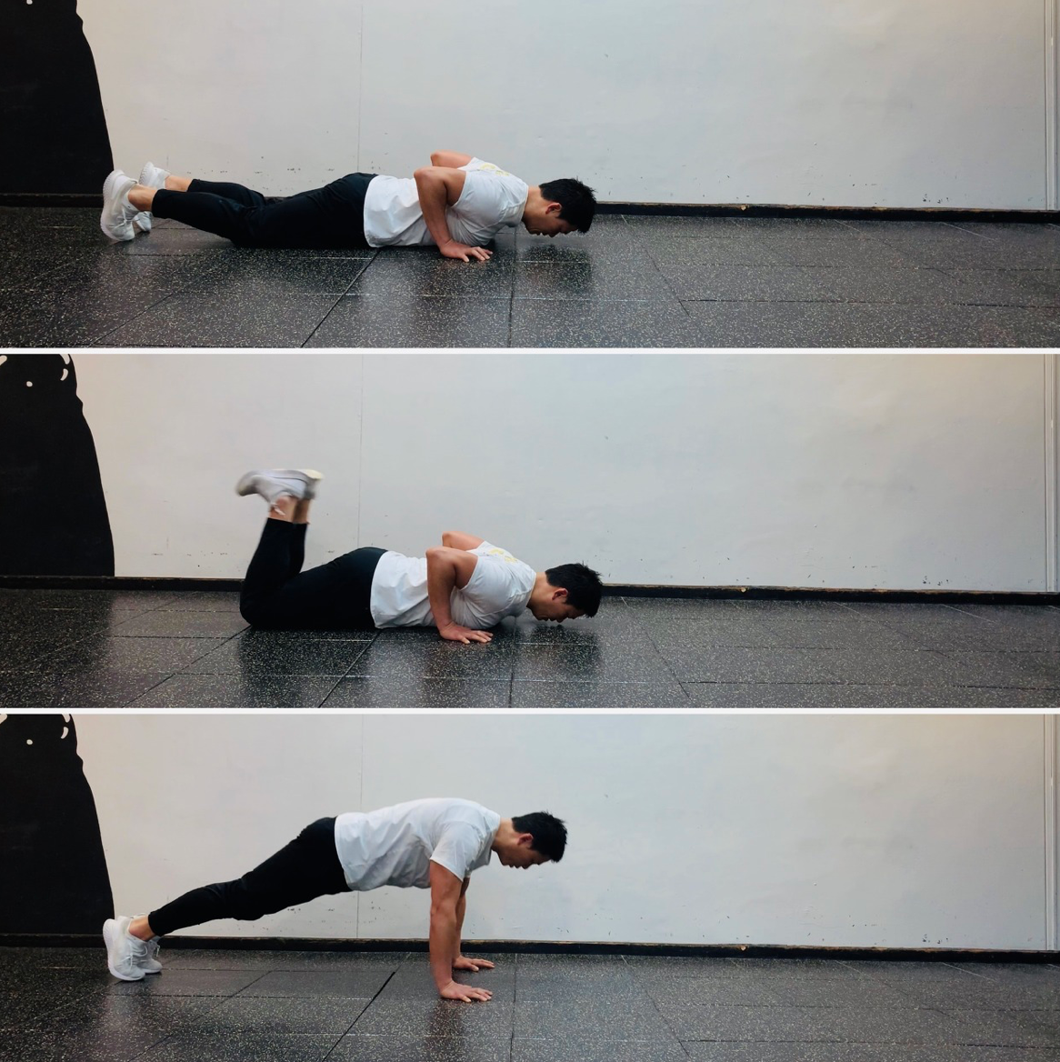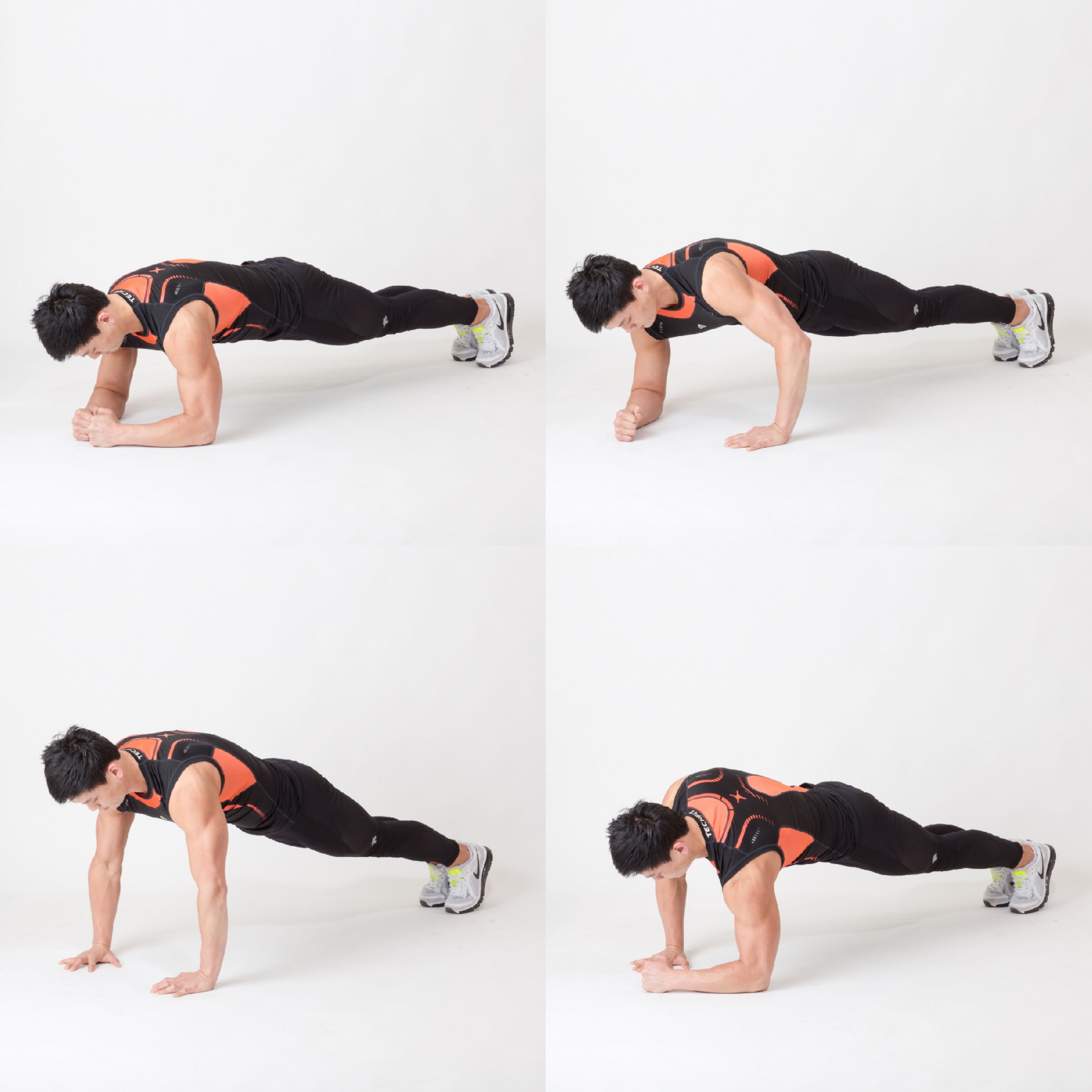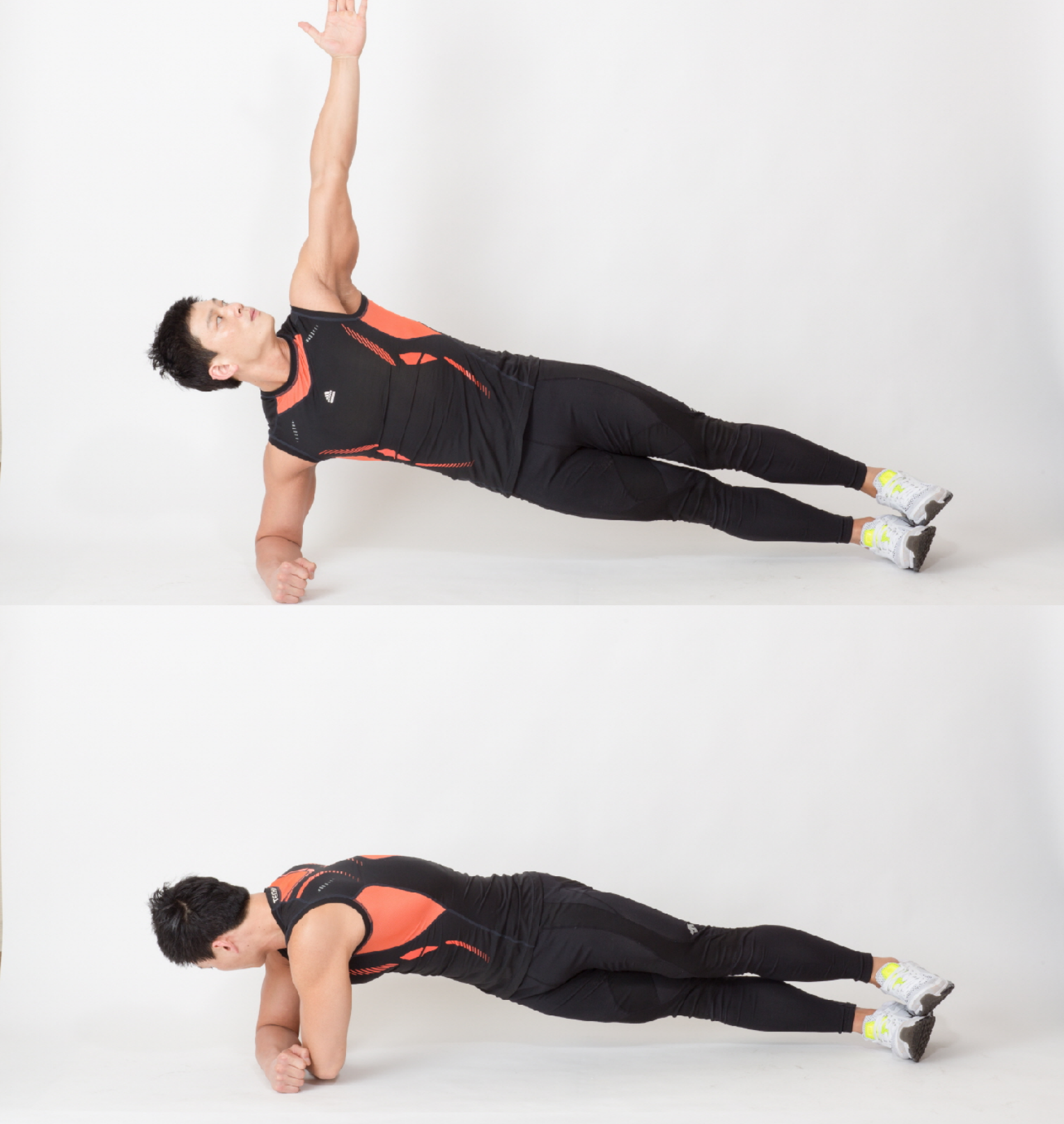 1. 플랭크 포지션에서 자세를 유지하고 왼손으로 팔꿈치가 있던 지면을 짚으면서 팔꿈치를 편다.