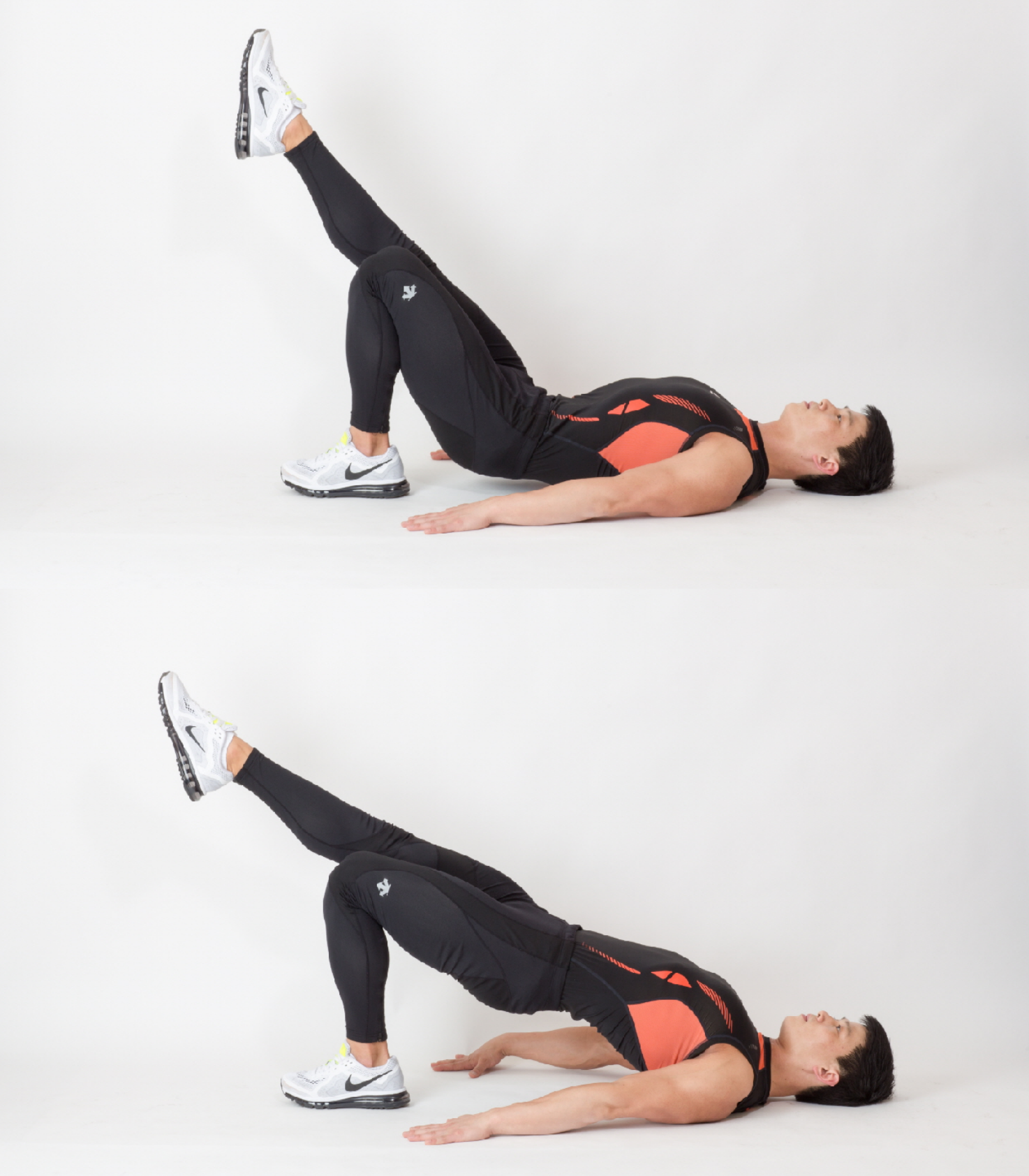 3. 둔부에 충분한 수축을 느낀 후 천천히 시작 자세로 돌아가 엉덩이가 지면에 닿기 직전까지 내렸다가 다시 들어 올린다.