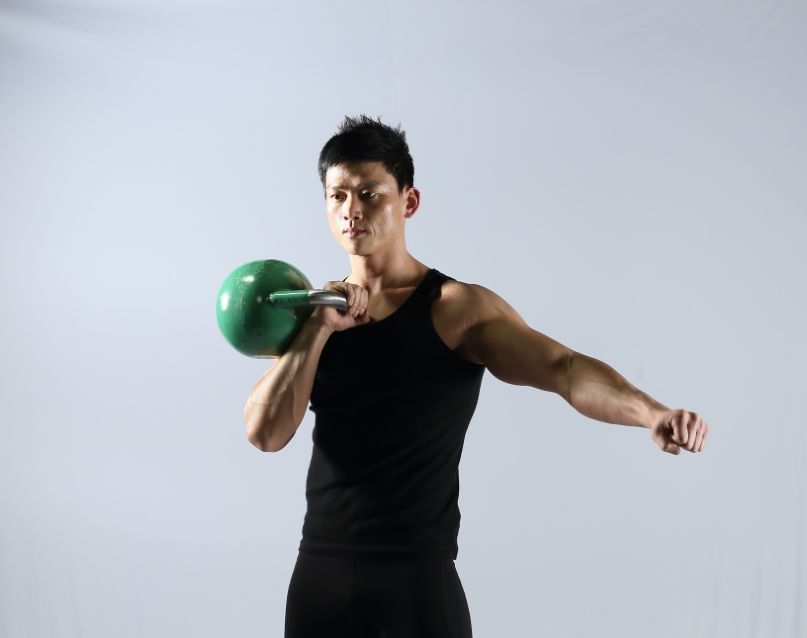 케틀벨 운동이 처음인 분들은 두개 보다는 하나를 이용해 동작을 우선 실시해 보시고, 케틀벨 프레스를 먼저 익숙해질 때까지 훈련해 보세요.