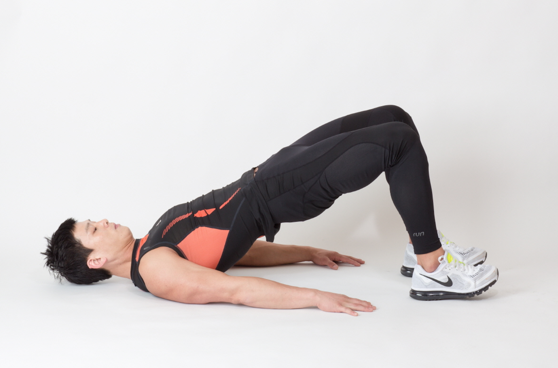 1. 바닥에 등을 대고 누워 무릎은 90도 굽혀 대퇴부와 몸이 90도가 되게 들어올린다.