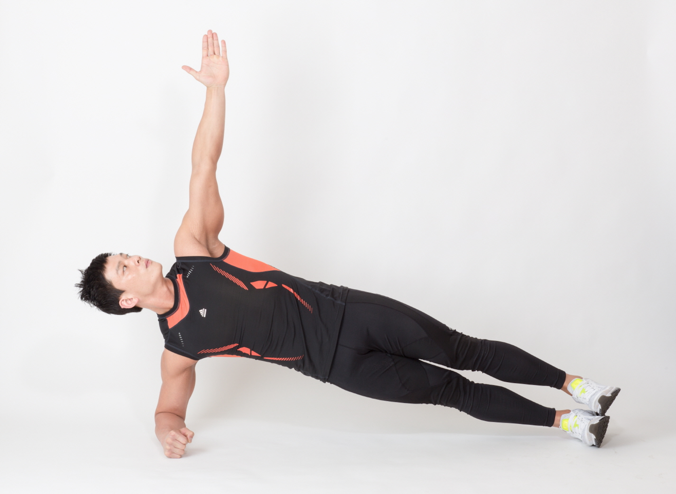 하이 플랭크 원암 레이저 풋 터치 / high plank with one-arm raise foot touch